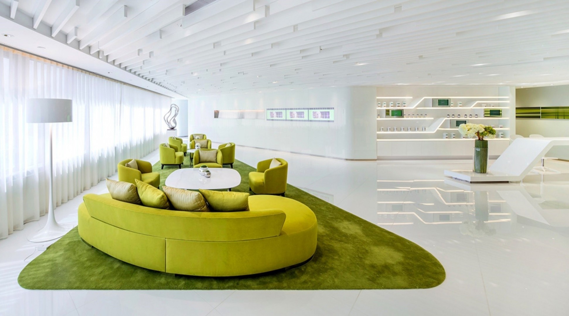 Salon w odcieniach błękitu, stylizowany na współczesny teatr ze zdjęciami tancerzy baletowych na ścianach