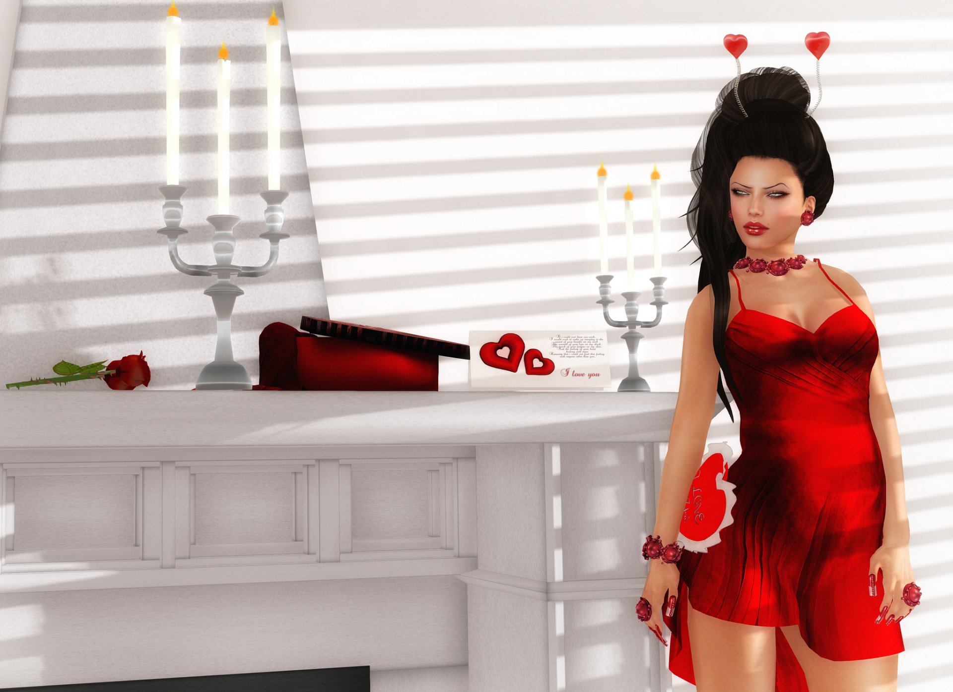 Dziewczyna w Czerwieni przy kominku z różą i świecami
