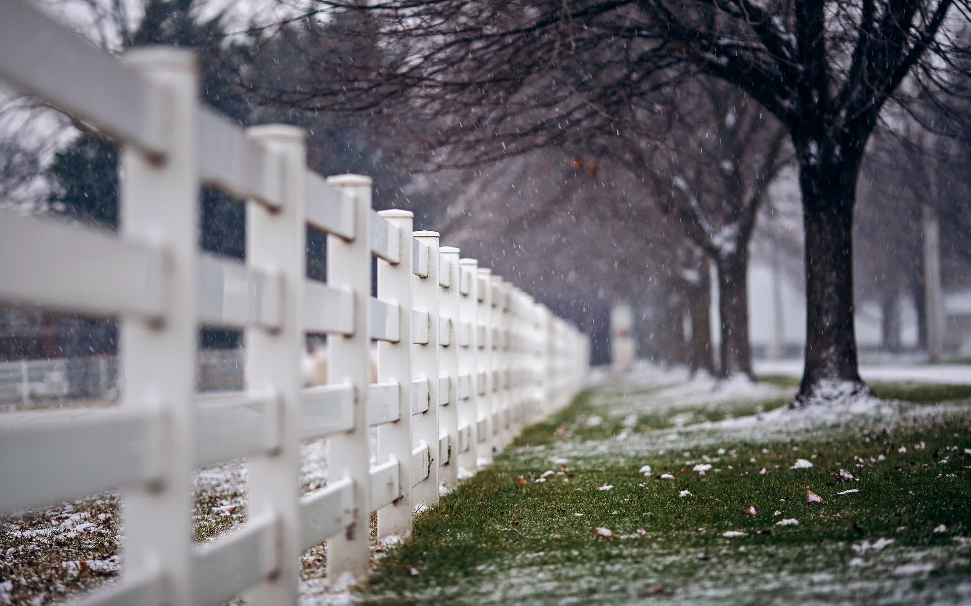 Ulica miejska z białym płotem i pierwszym śniegiem
