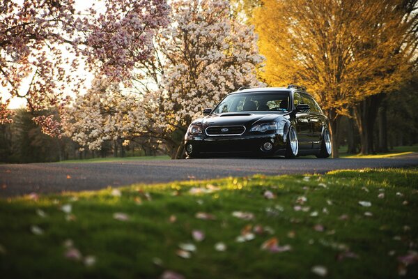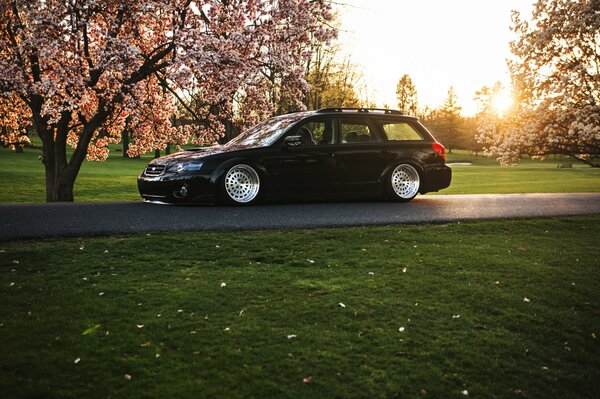 Czarny Subaru z białymi tarczami w słoneczny dzień