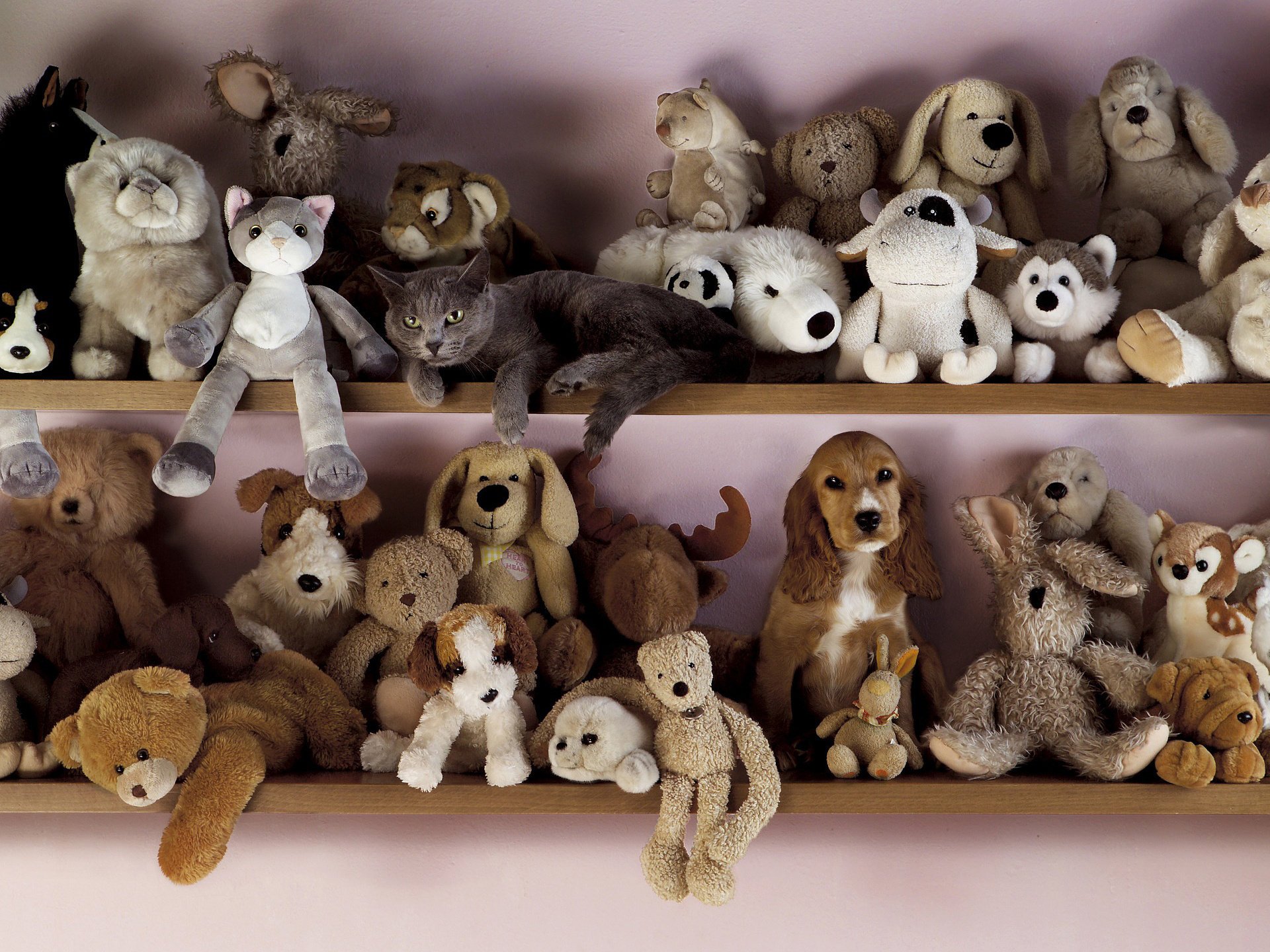 Śliczny, biały, Pluszowy szczeniak z Obroża