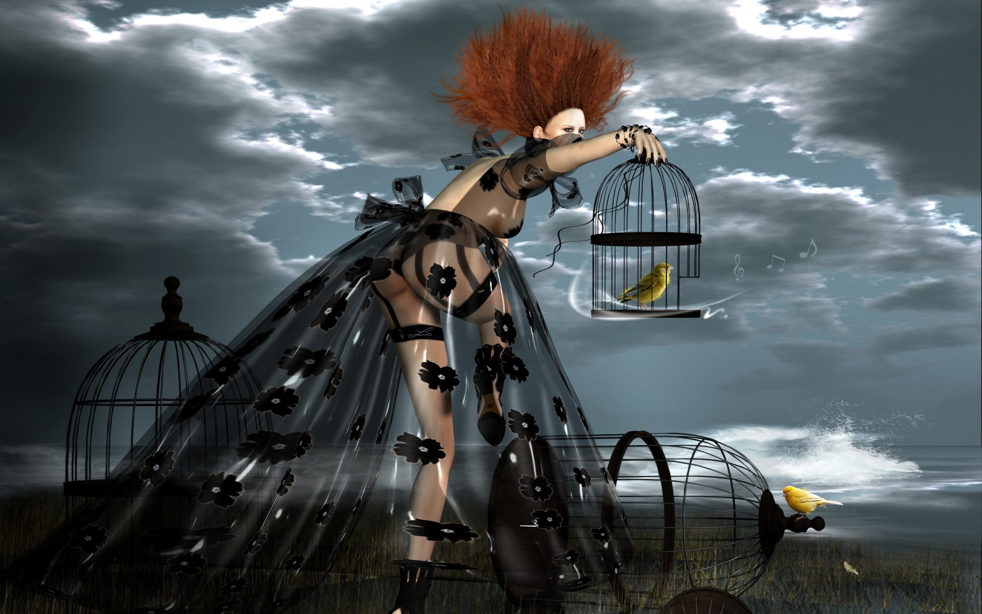 Kobieta stojąca w przezroczystej sukience i trzymająca jednego z kanarków w klatce