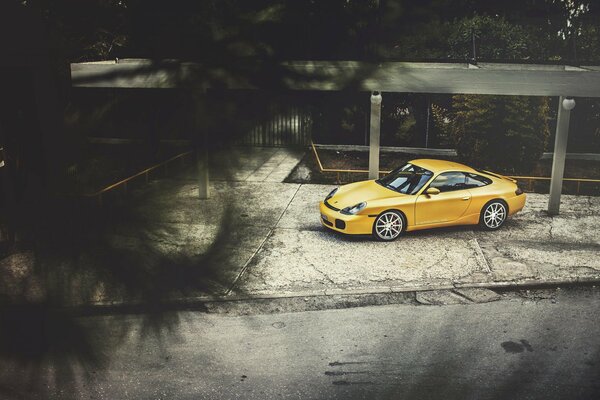 Żółte porsche carrera w letnim lesie