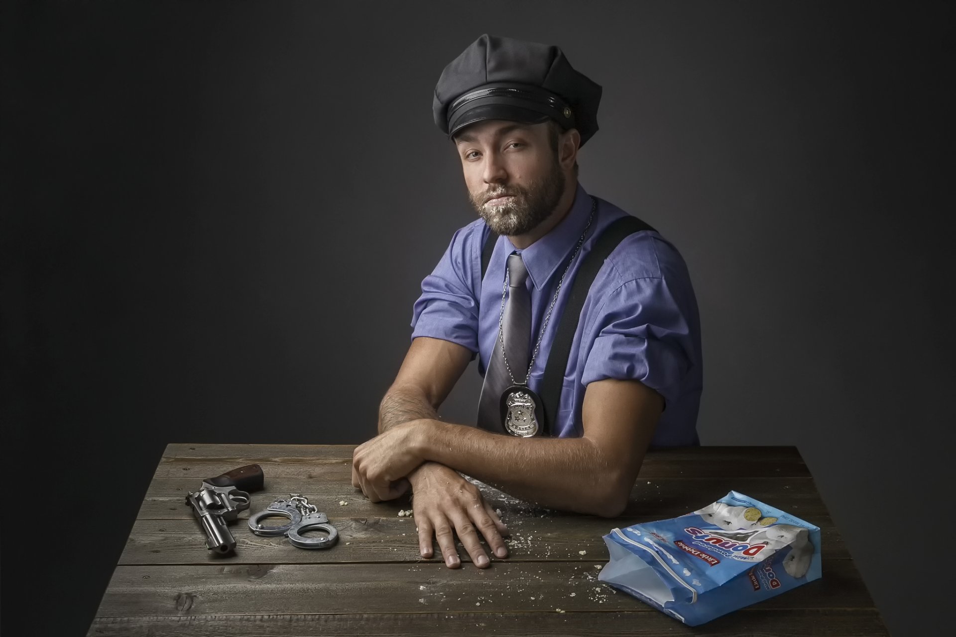 Policjant pozuje do zdjęcia. Na stole rewolwer, kajdanki i paczka pączków