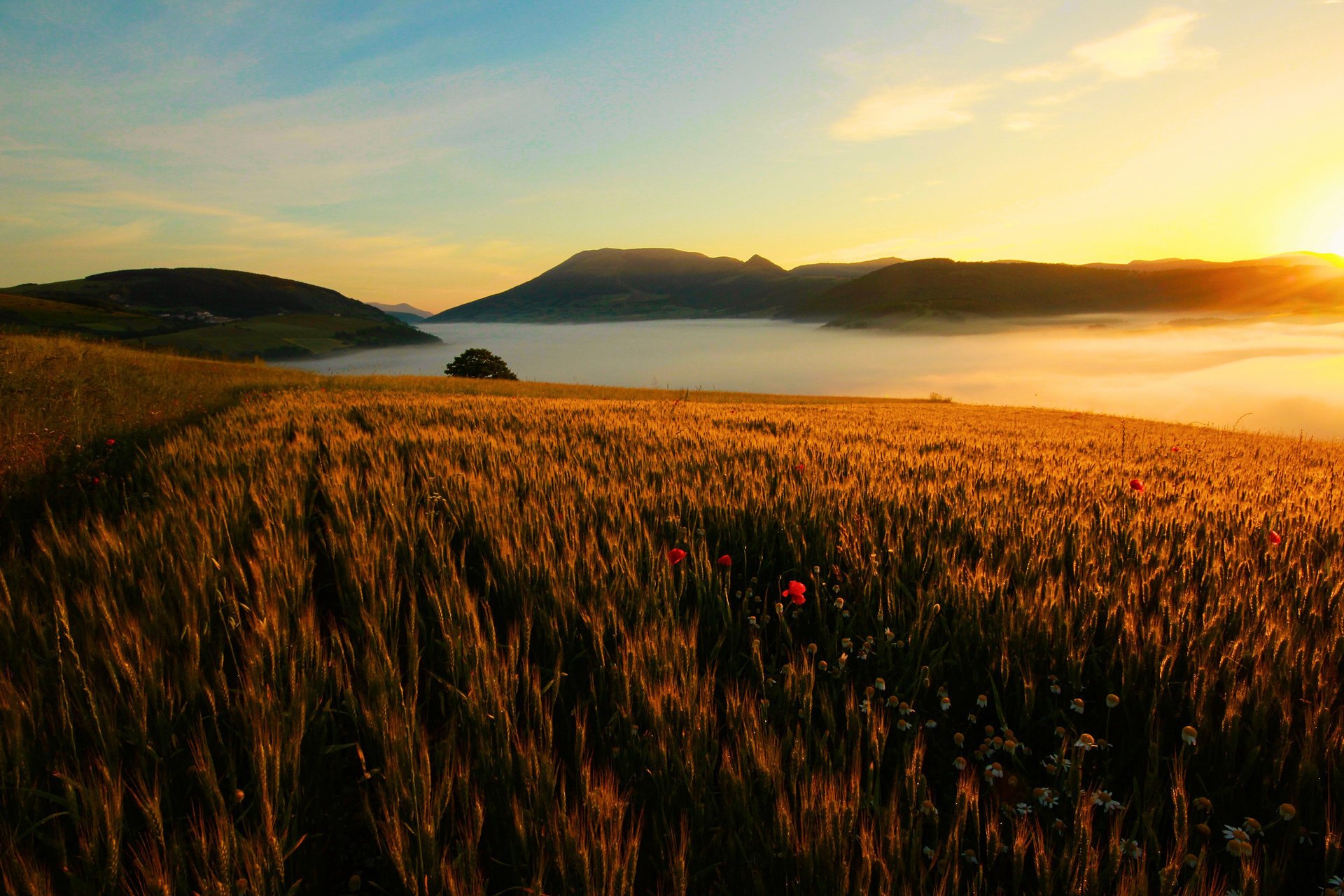 Zakochana para mężczyzna i kobieta w uścisku na polu na tle zachodzącego słońcaZakochana para mężczyzna i kobieta w uścisku na polu na tle zachodzącego słońca