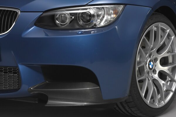 Samochód bmw w kolorze niebieskim widok przedniego reflektoraSamochód BMW w Kolorze Niebieskim widok przedniego reflektora