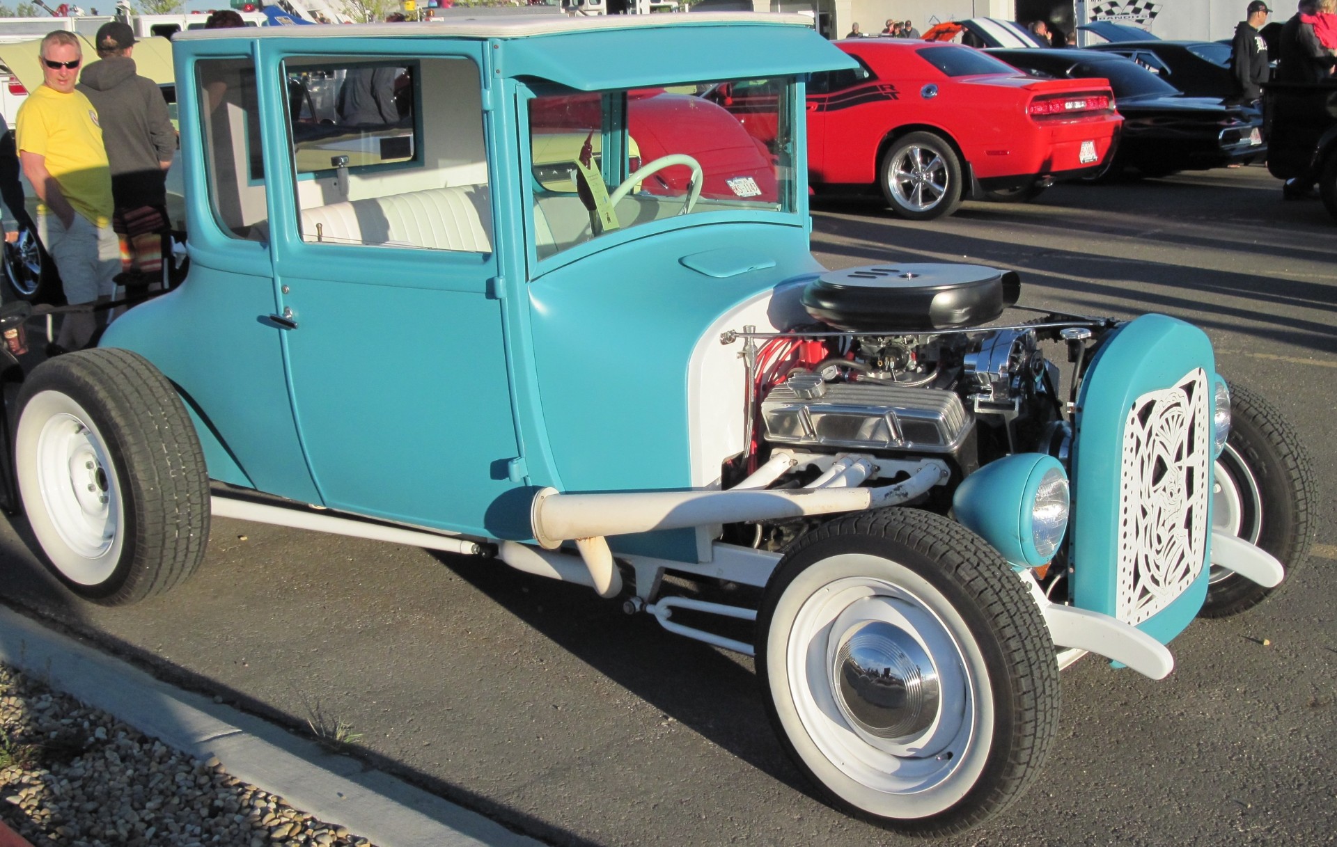 Zdjęcie klasycznego niebieskiego Forda z otwartym silnikiem