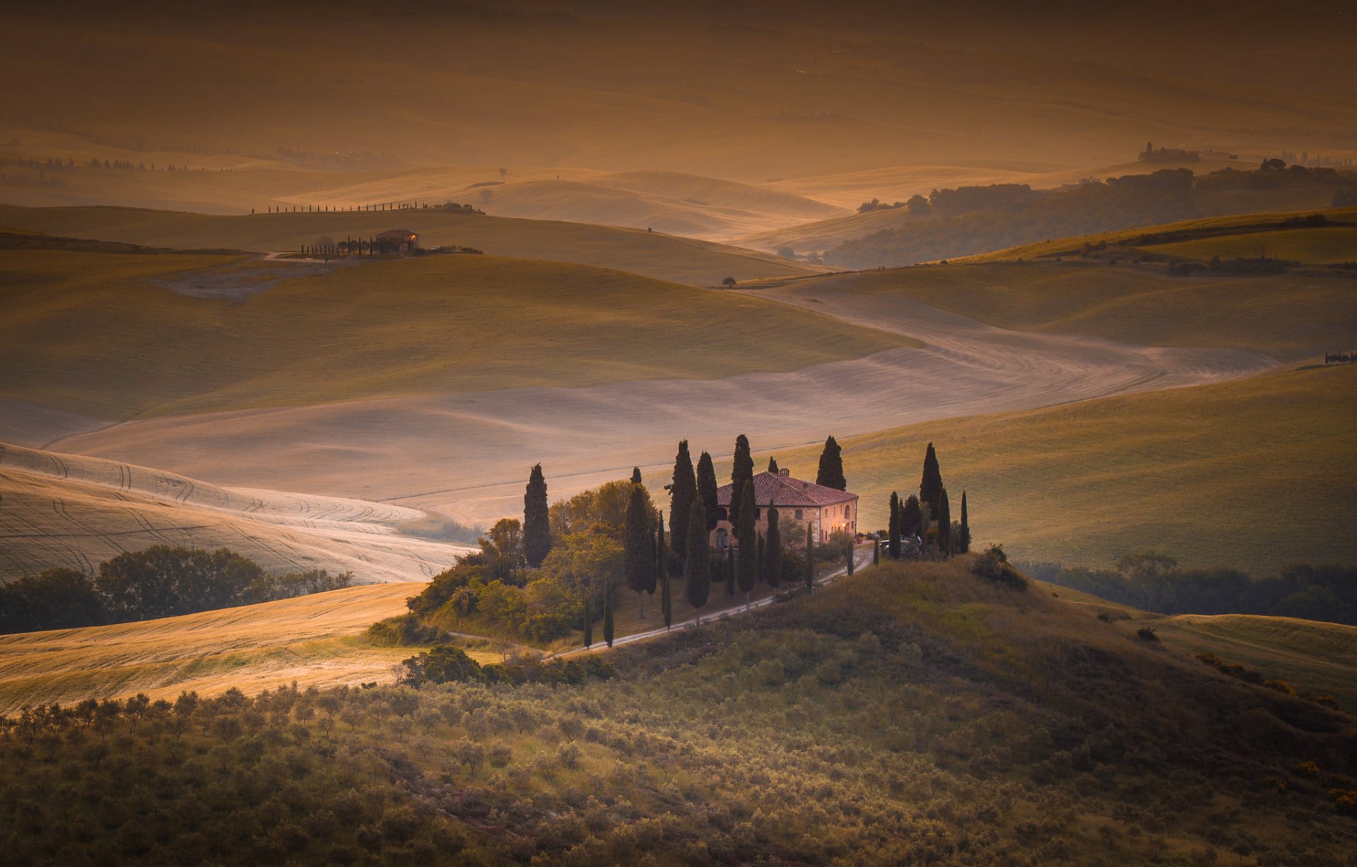 Jesienne pole Toskanii, w oddali chmury nisko pochylone nad wsią