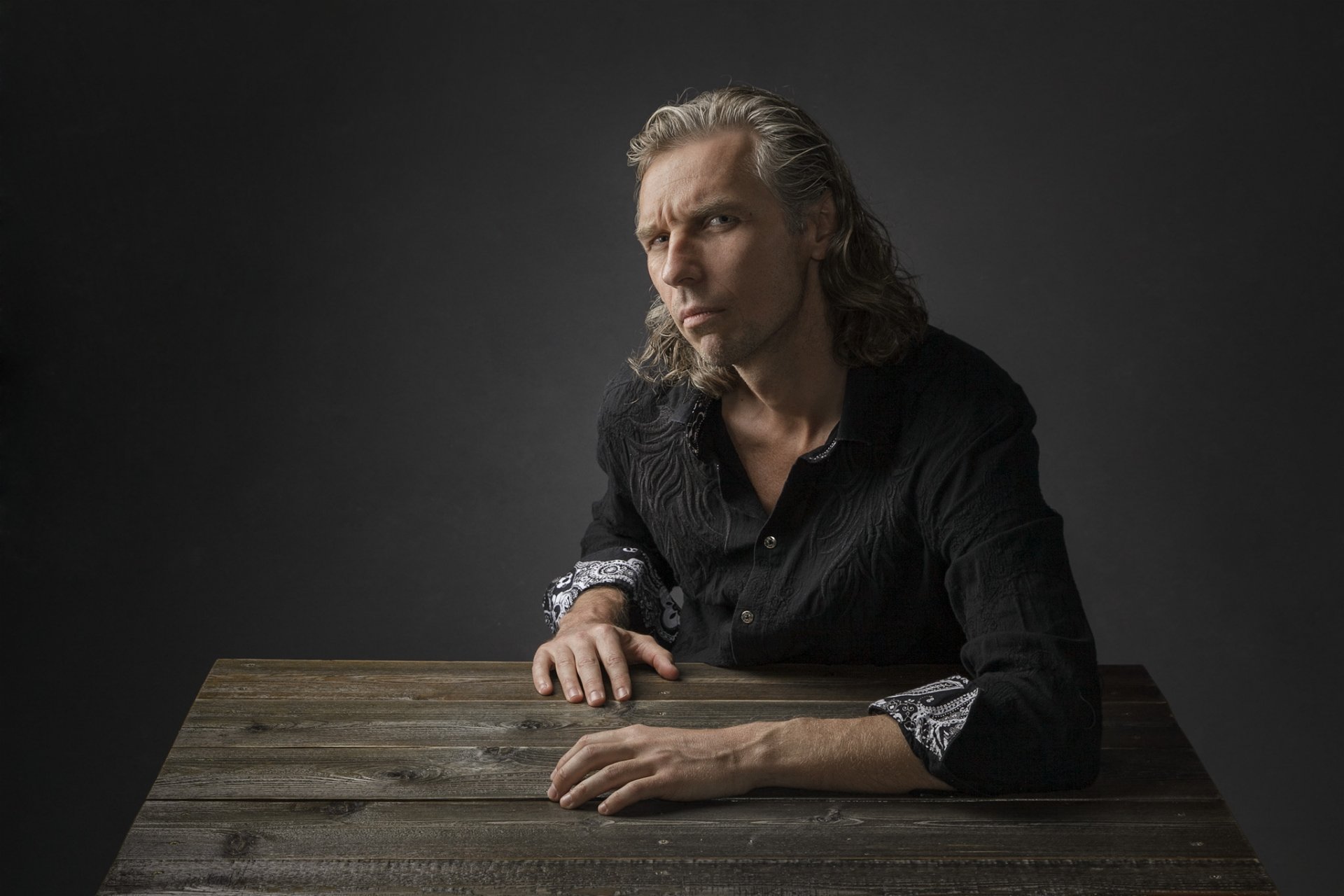 Mężczyzna przy stole, z wnikliwym spojrzeniem