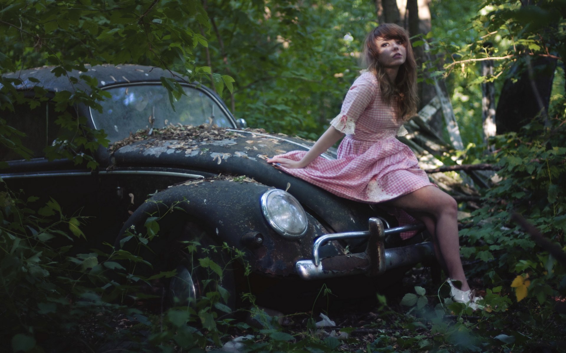 Romantyczna dziewczyna na opuszczonym samochodzie retro w lesie