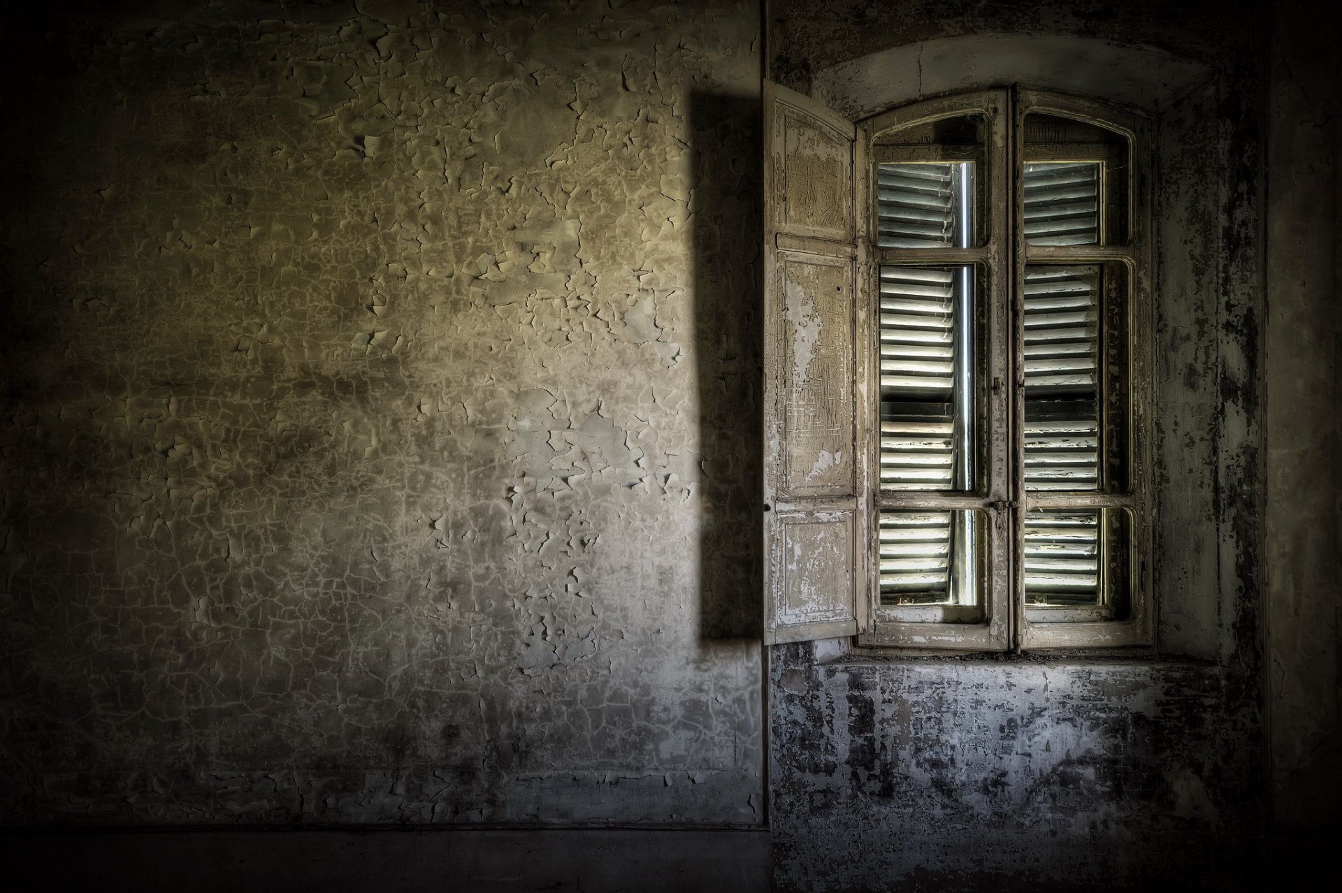 Opuszczony stary pokój z drzewami wyglądającymi przez okno