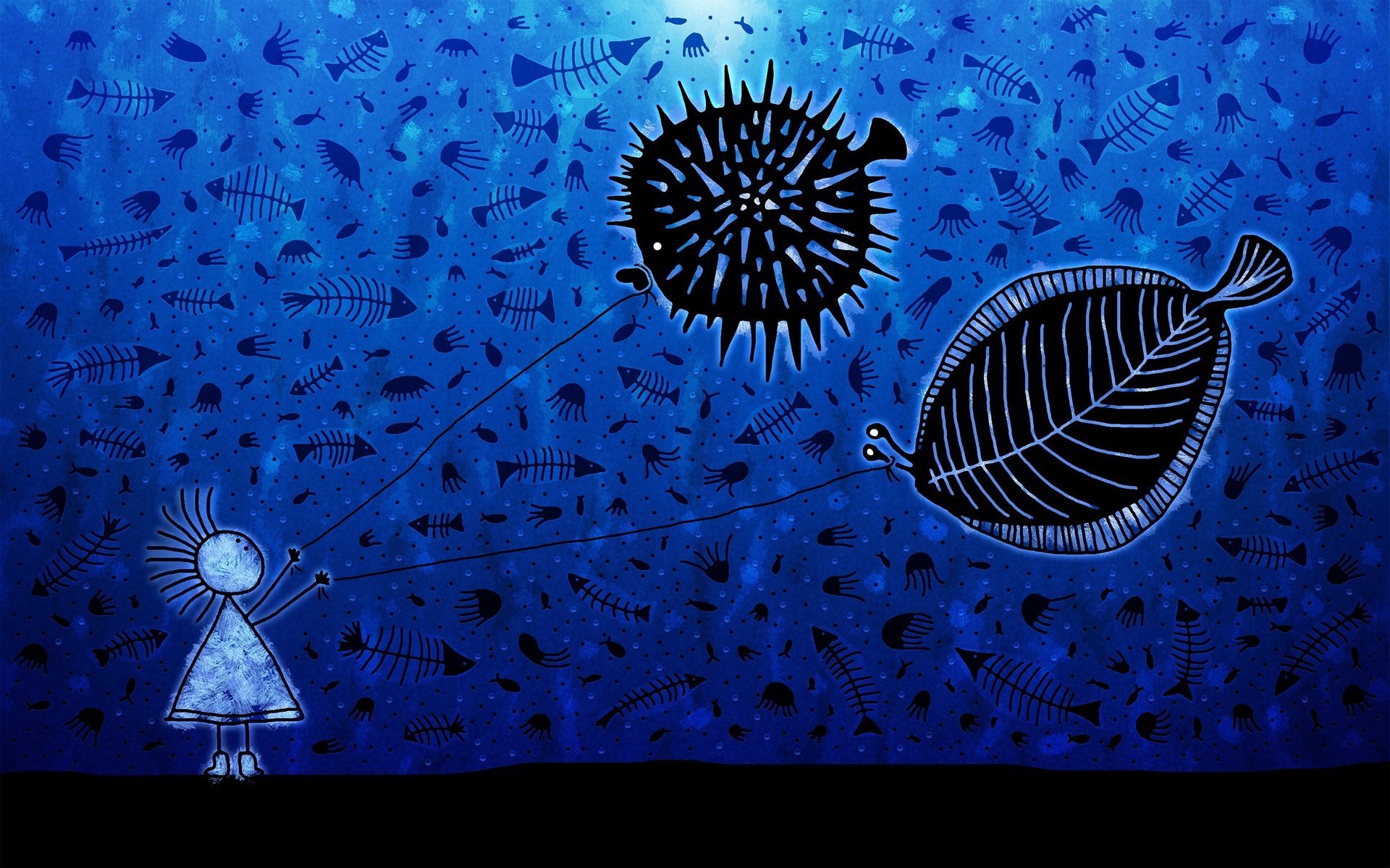 Abstrakcyjny rysunek dziewczyny ze szkieletem ryby i drobnoustrojemAbstrakcyjny Rysunek dziewczyny ze szkieletem ryby i drobnoustrojem