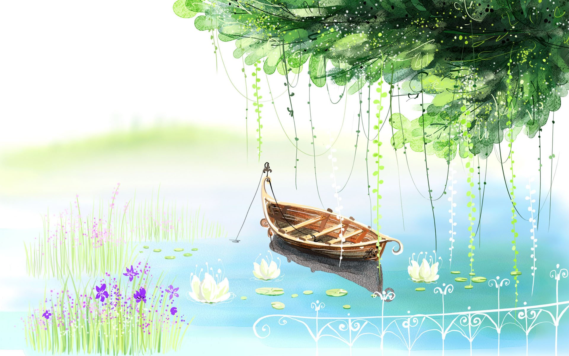 Rysunek Łodzi w jeziorze z liliami wodnymi