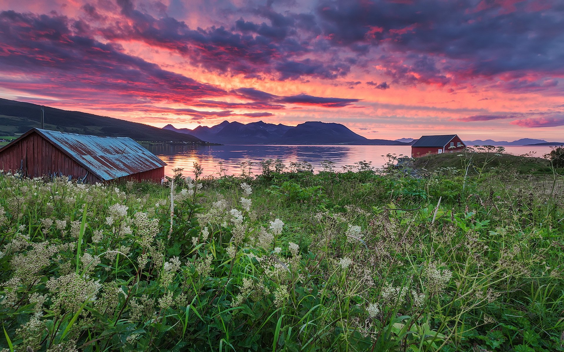 Jeleń nad jeziorem o zachodzie słońca w odcieniach pomarańczy