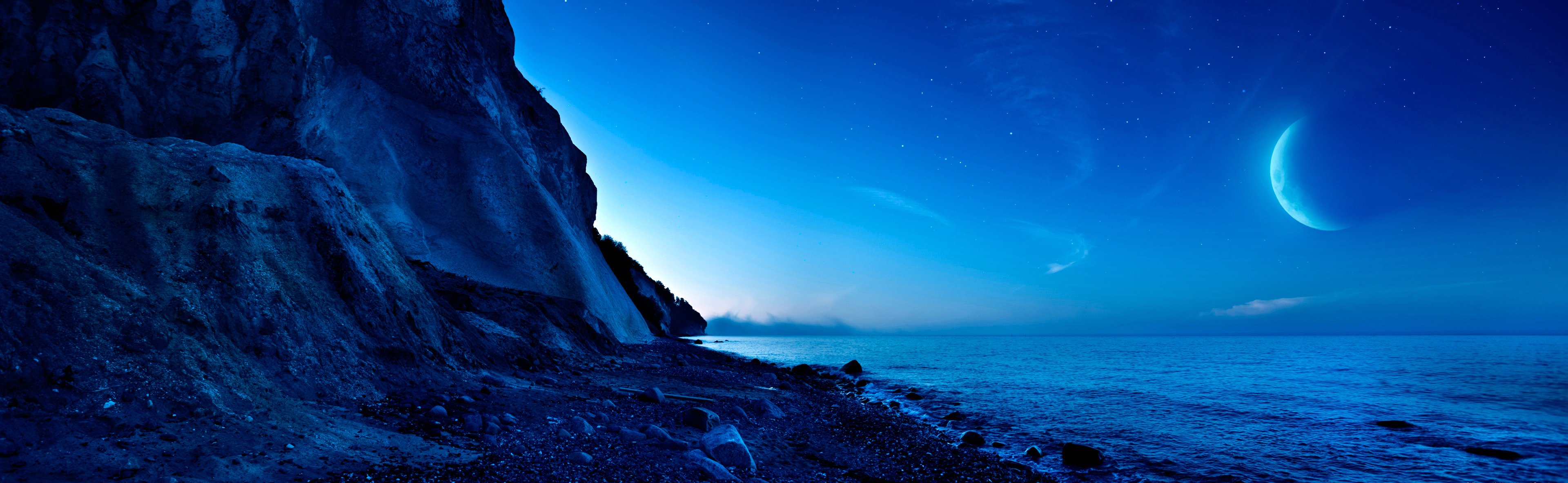 Brzeg morza w pobliżu wzgórz w świetle księżyca