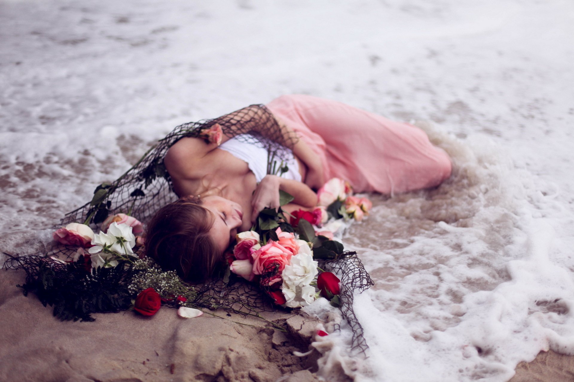 Sesja zdjęciowa wśród morza. dziewczyna w czerwonej sukience