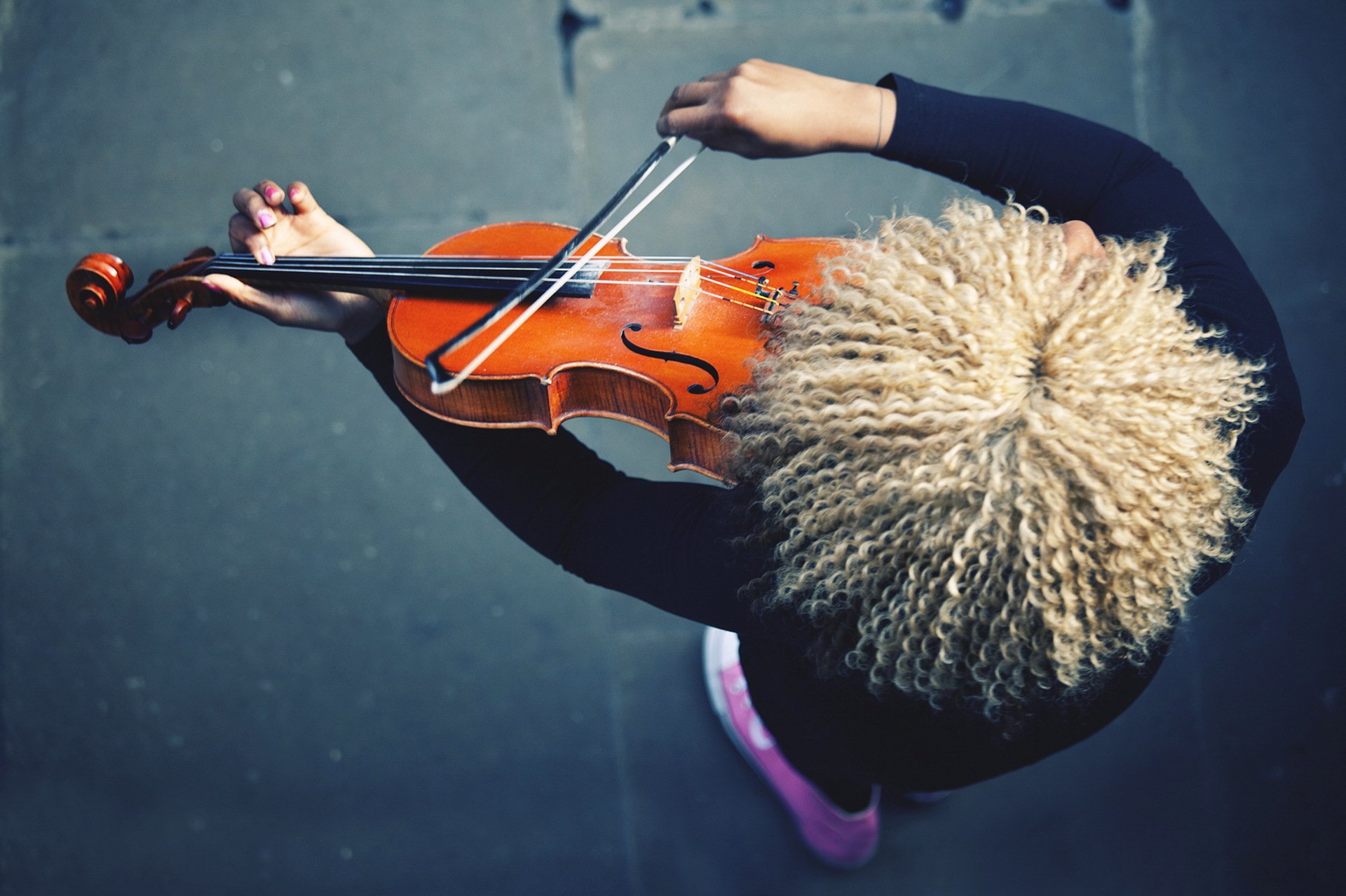 Dziewczyna z długimi włosami gra na skrzypcach