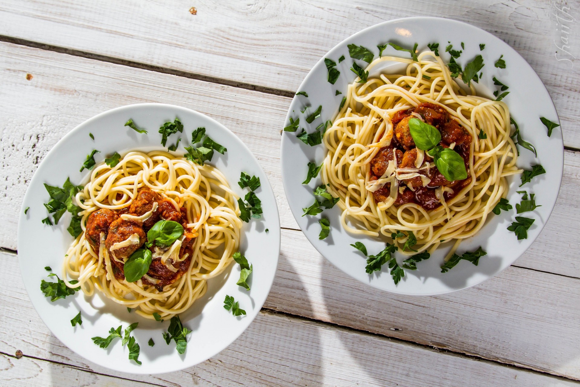 Spaghetti bolognese z ziołami na talerzach