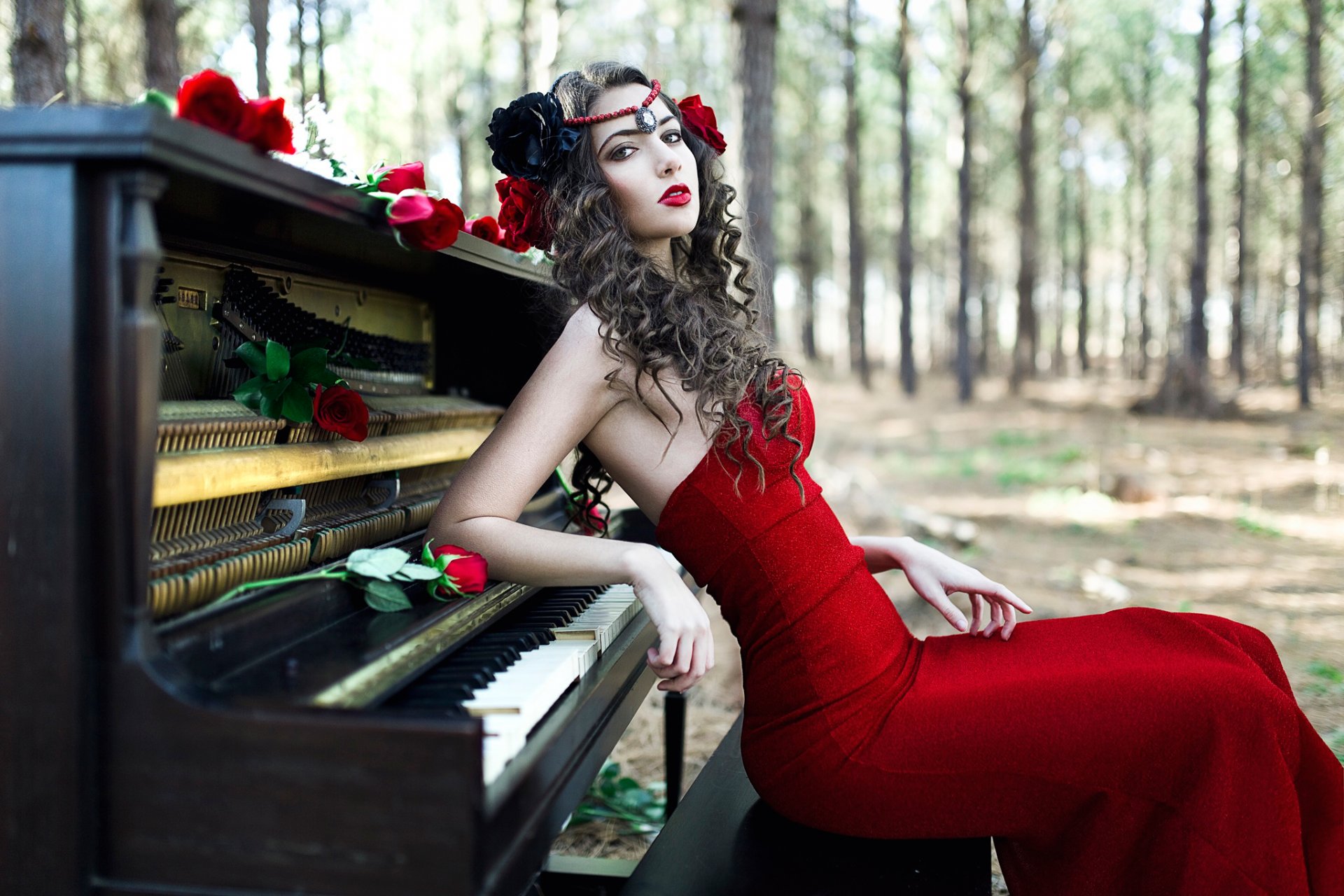 Dziewczyna w czerwonej sukience siedzi przy fortepianie
