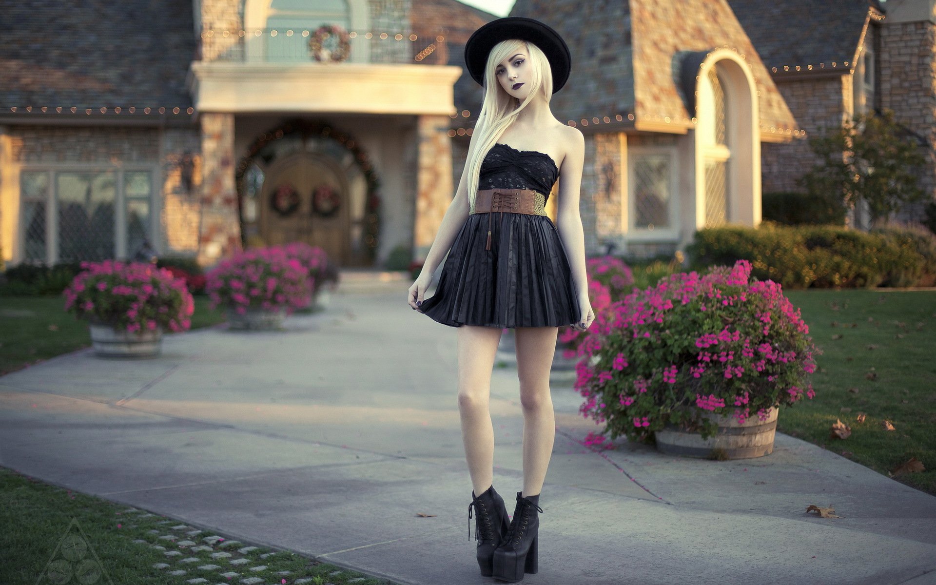 Dziewczyna w czarnej sukience pozuje na tle domu