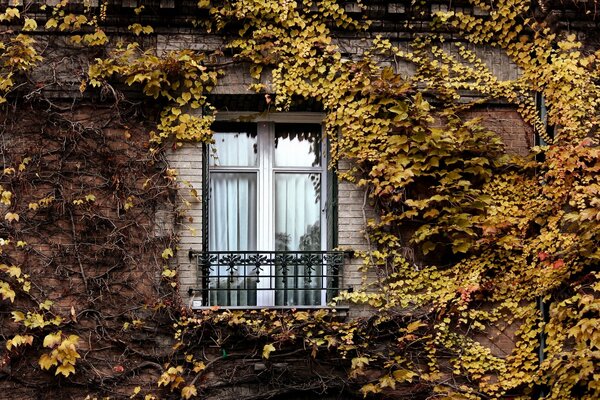 Okno z jesiennym bluszczem w Paryżu