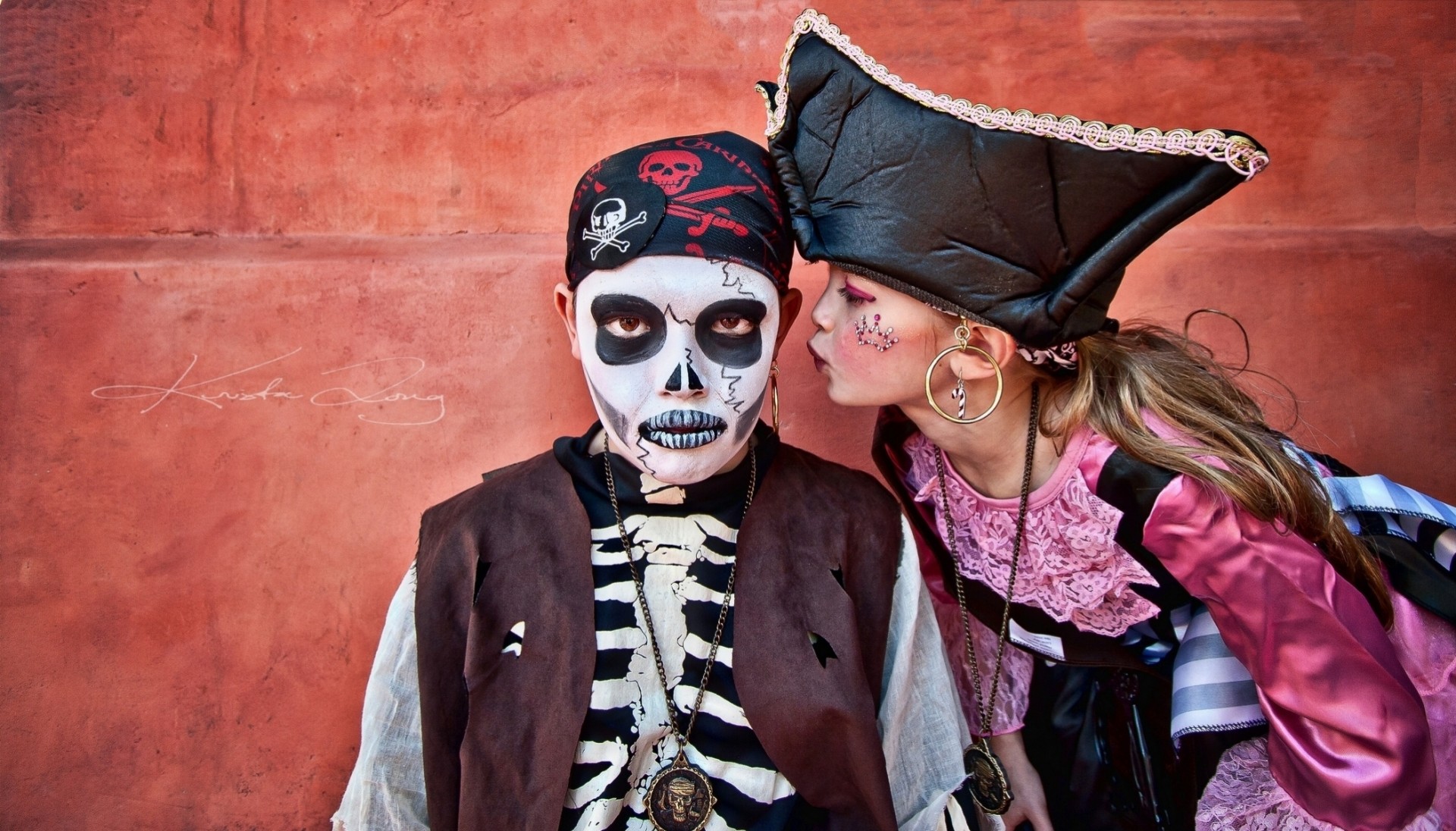 Dziewczyna w pirackim garniturze całuje faceta