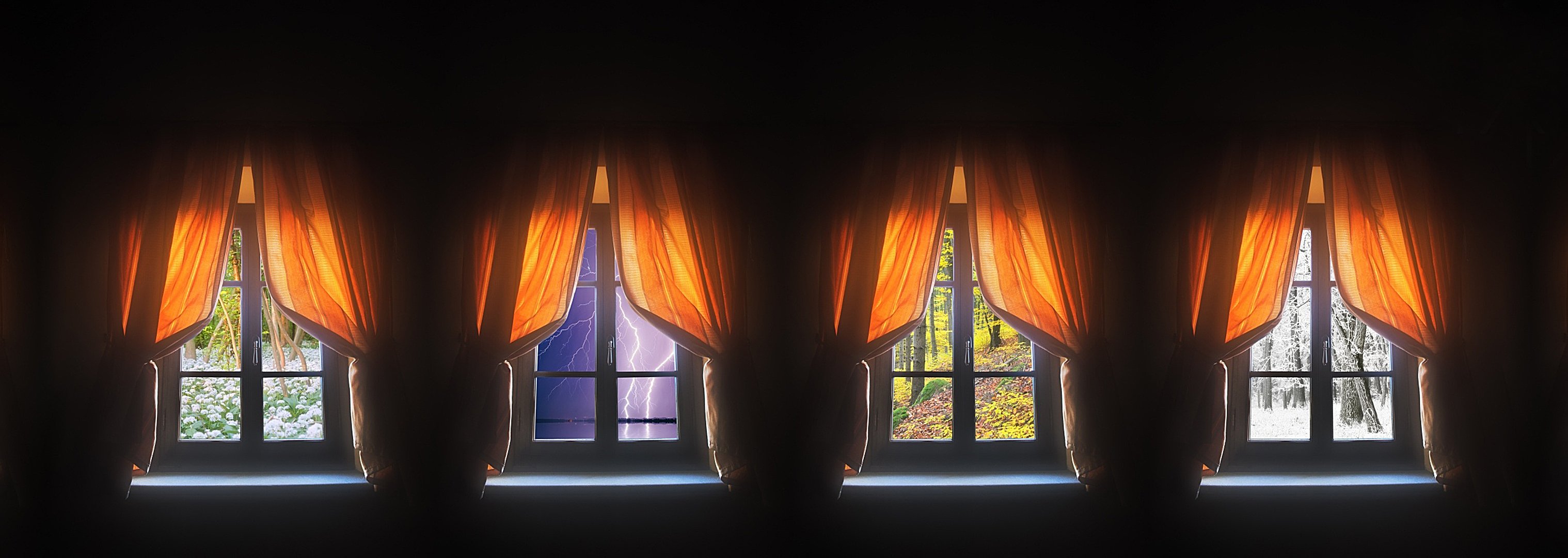 Kominek i skórzane fotele na tle zaokrąglonego okna