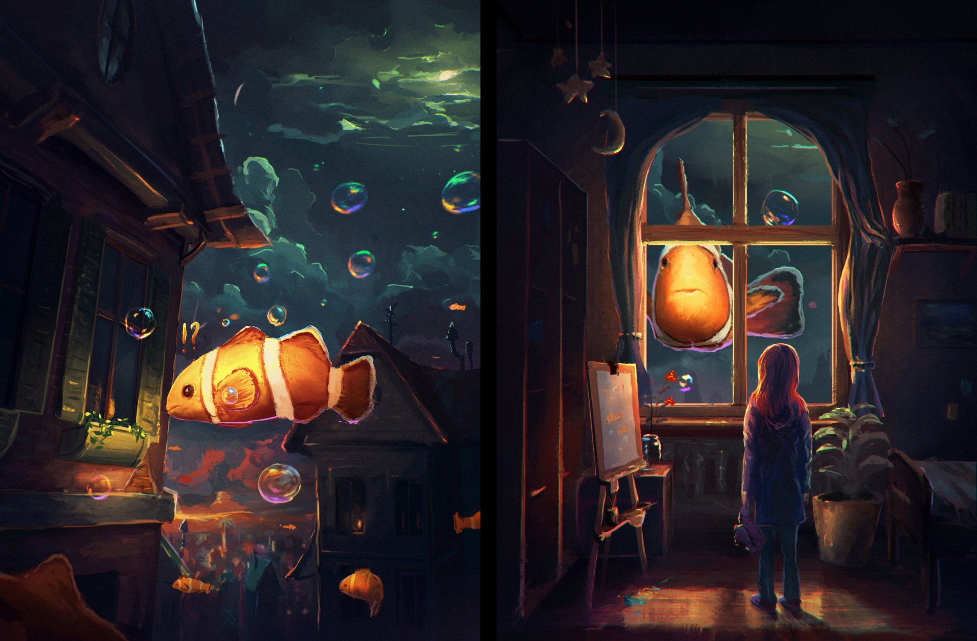 Fantastyczna sztuka z rybami na nocnym niebie za oknem