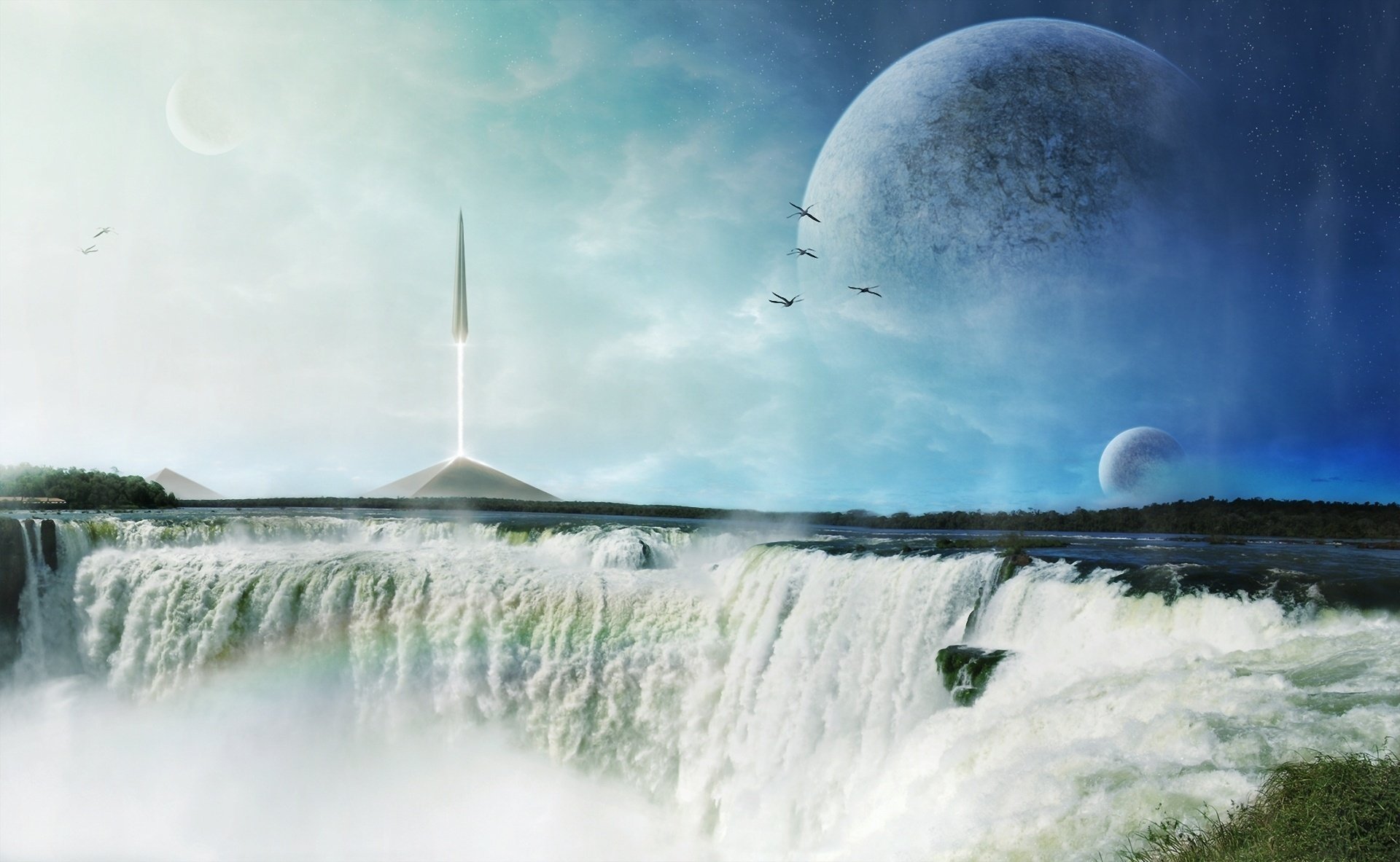 Tapeta artystyczna. wodospad na tle rakiety lecącej w kierunku innych planetTapeta artystyczna. Wodospad na tle rakiety lecącej w kierunku innych planet
