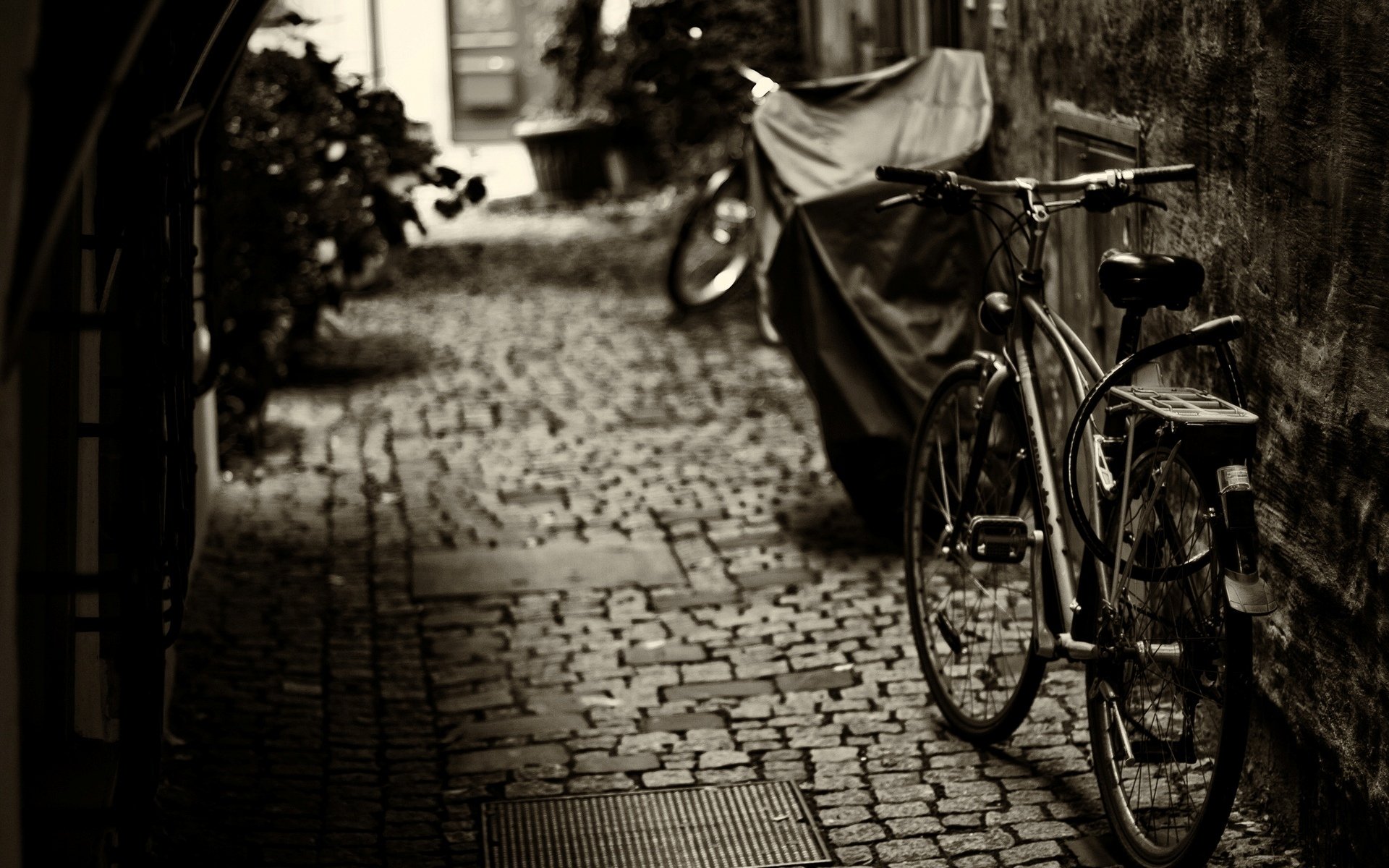 Czarny biały obraz ulicy z rowerami