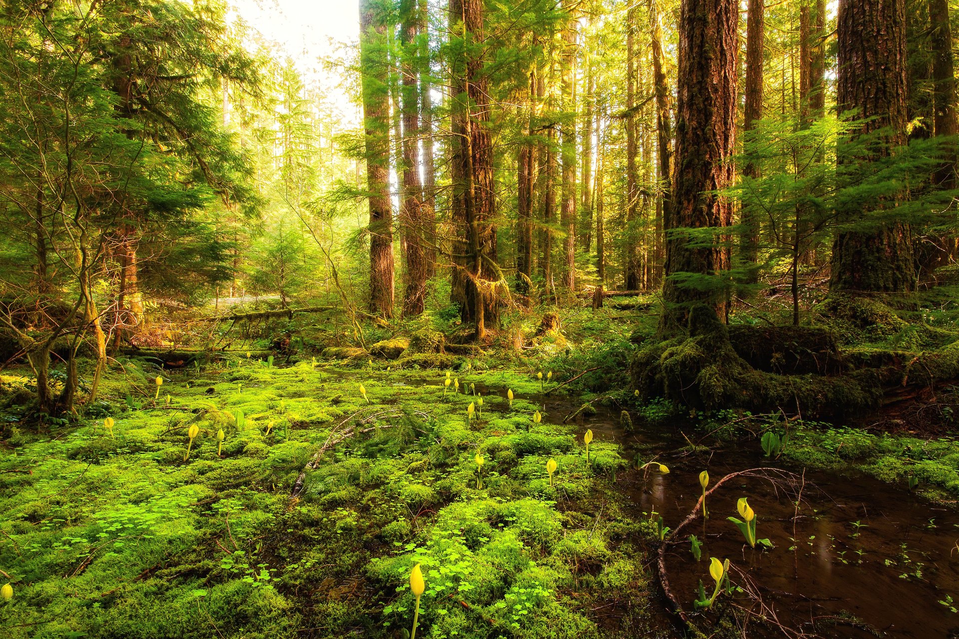 W lesie zakwitły kwiaty i zieleniła trawa