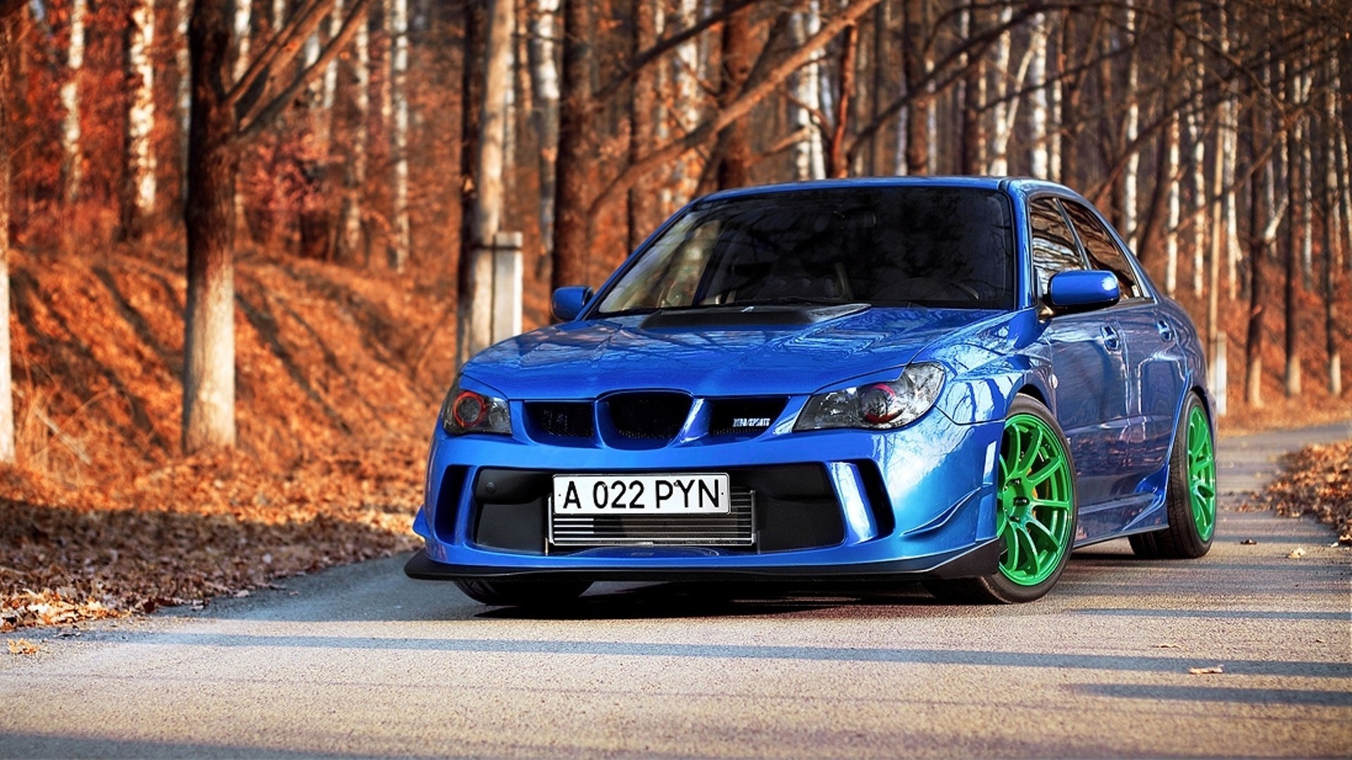 Samochód Subaru Impreza na jesiennej drodze
