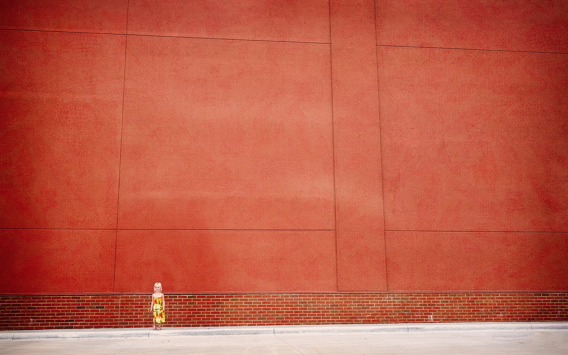 Dziewczyna stoi przy czerwonej ścianie na ulicy