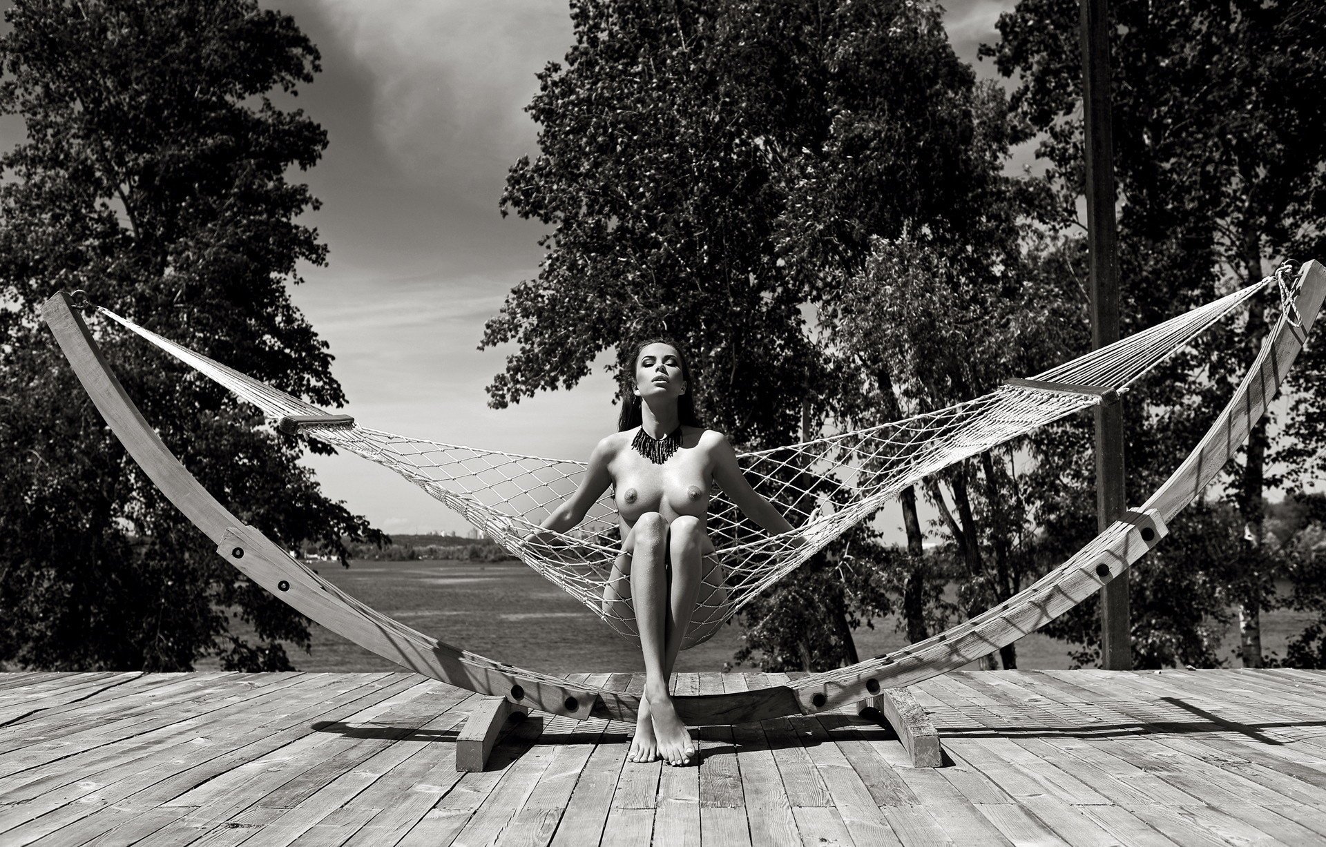 Czarno-białe zdjęcie leżącej nagiej modelki