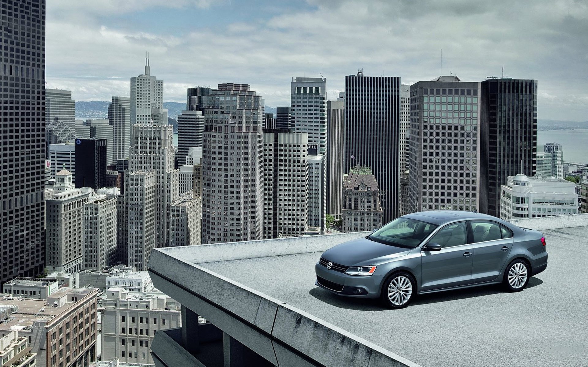 Folswagen w kolorze szarym pośrodku mostu i nocnego miasta