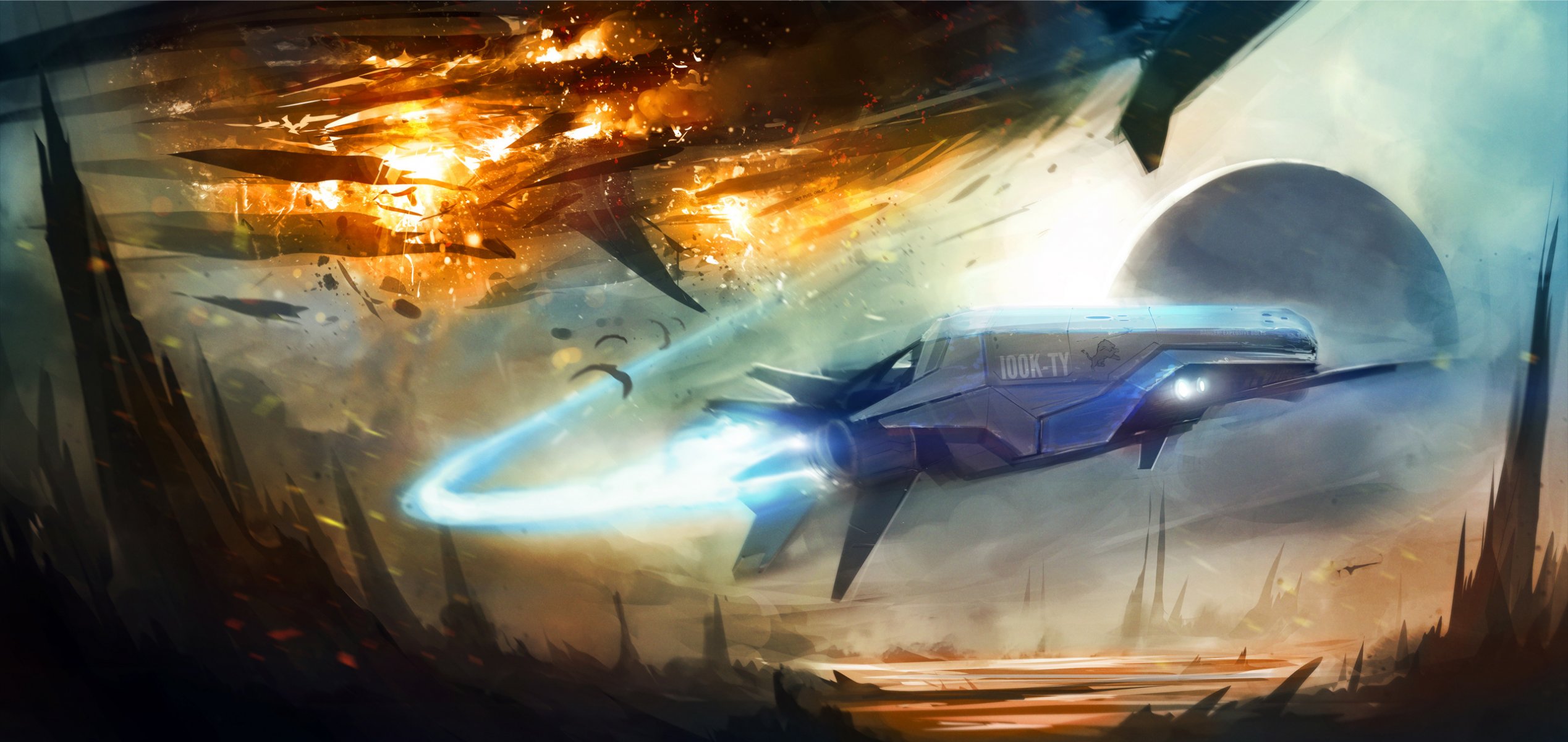 Sztuka walki statków kosmicznych na tle ciemnych gór i błękitnych Planet