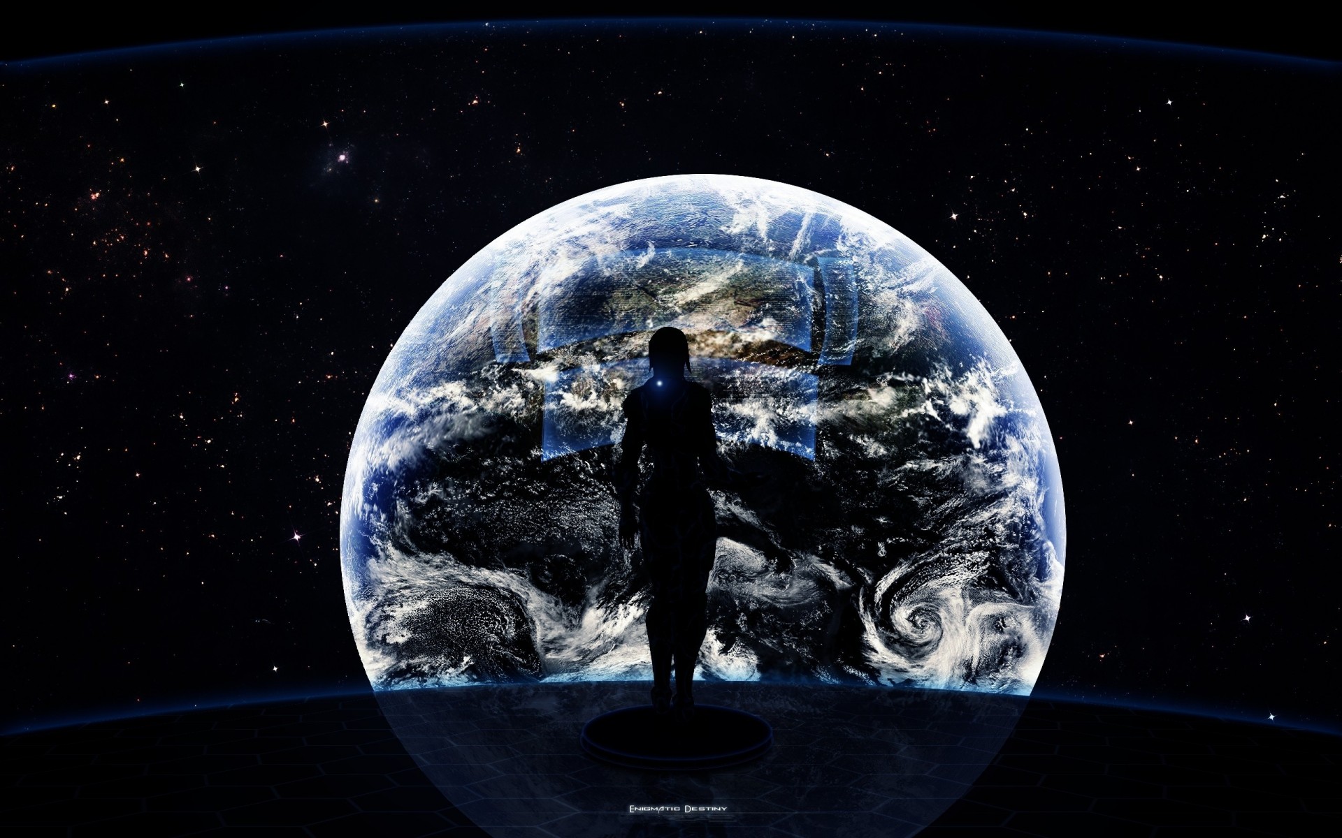 Mężczyzna patrzy przez Okno statku na planetę w kosmosie