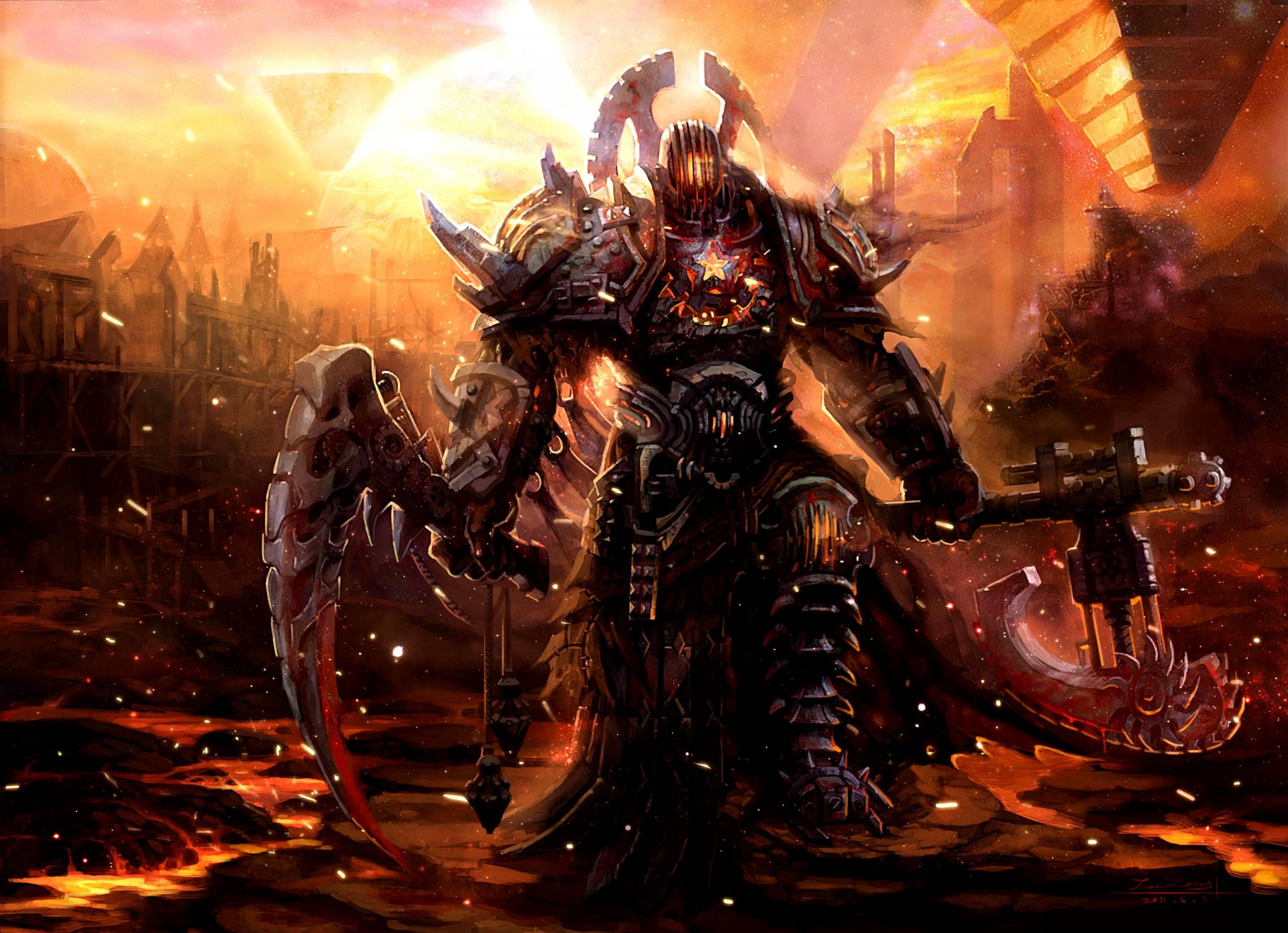 Wojownik jest ubrany w zbroję i hełm, z długimi ostrzami