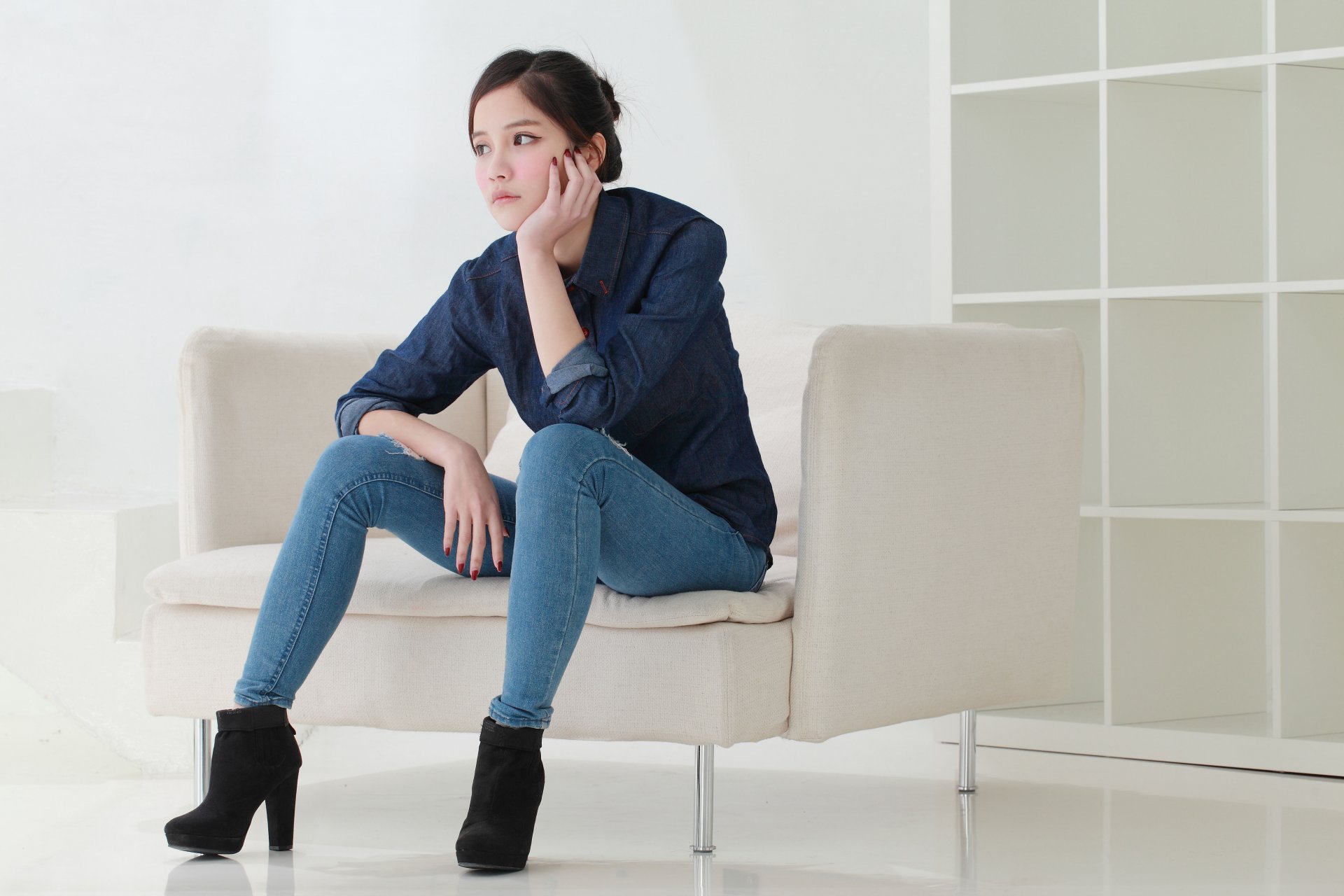 Wschodnia dziewczyna siedzi w białym fotelu na białym tle