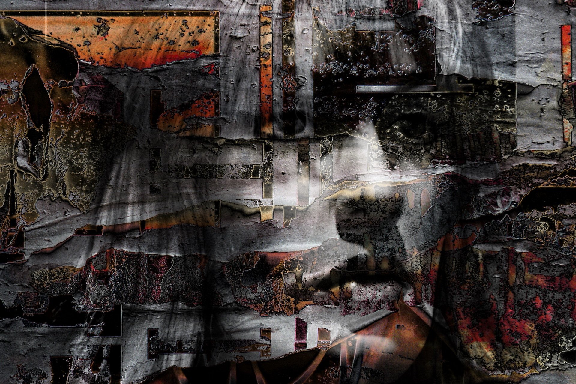 Odcisk dłoni na czarnym tle i pół twarzy dziewczynki z zielonymi oczami i włosami