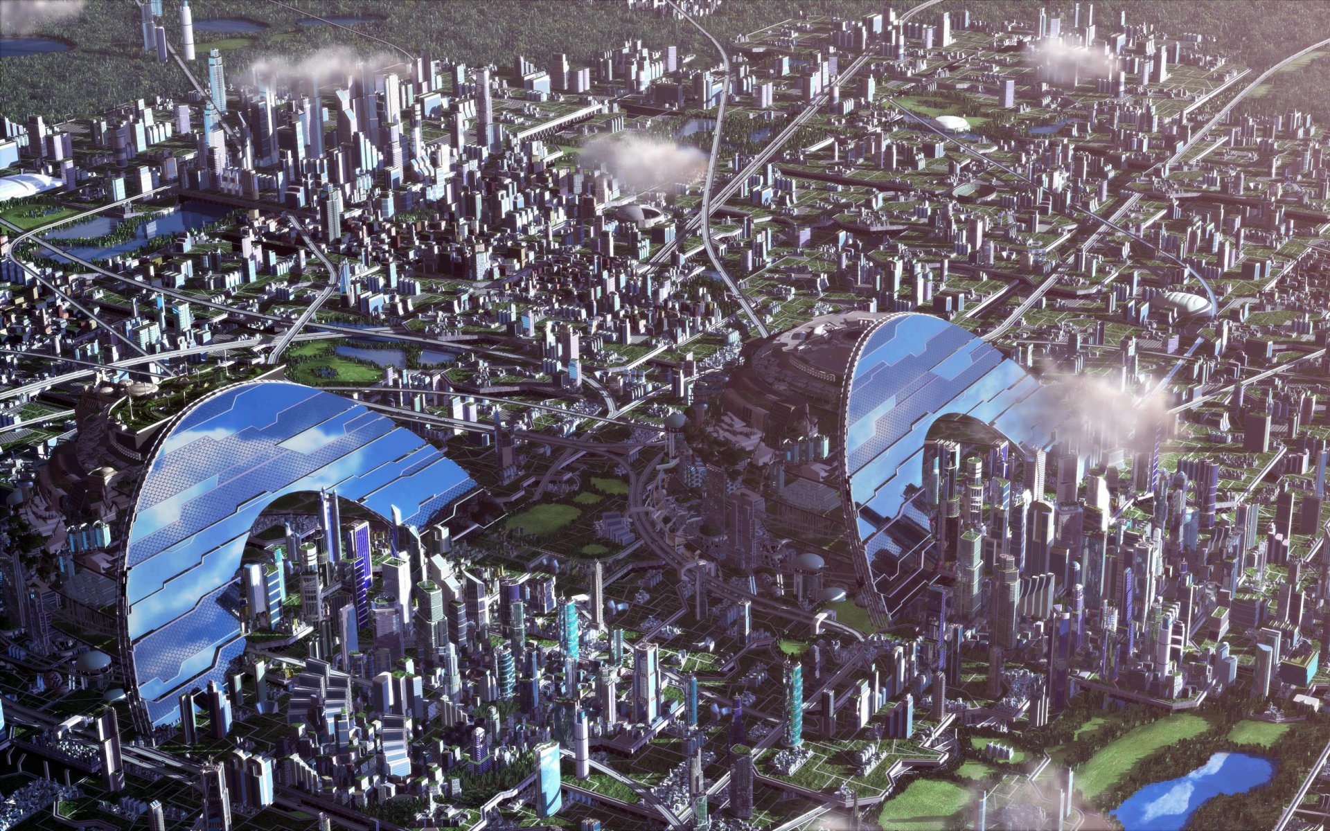 Czarno-biały obraz placu otoczonego budynkami z dwóch stron