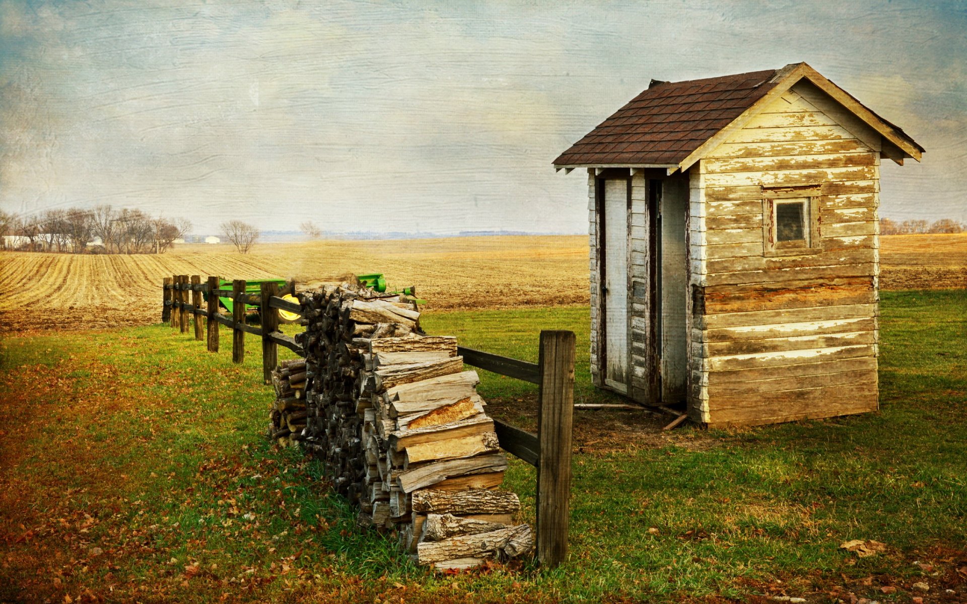 Obskurny budynek na środku pola z drewnem opałowym