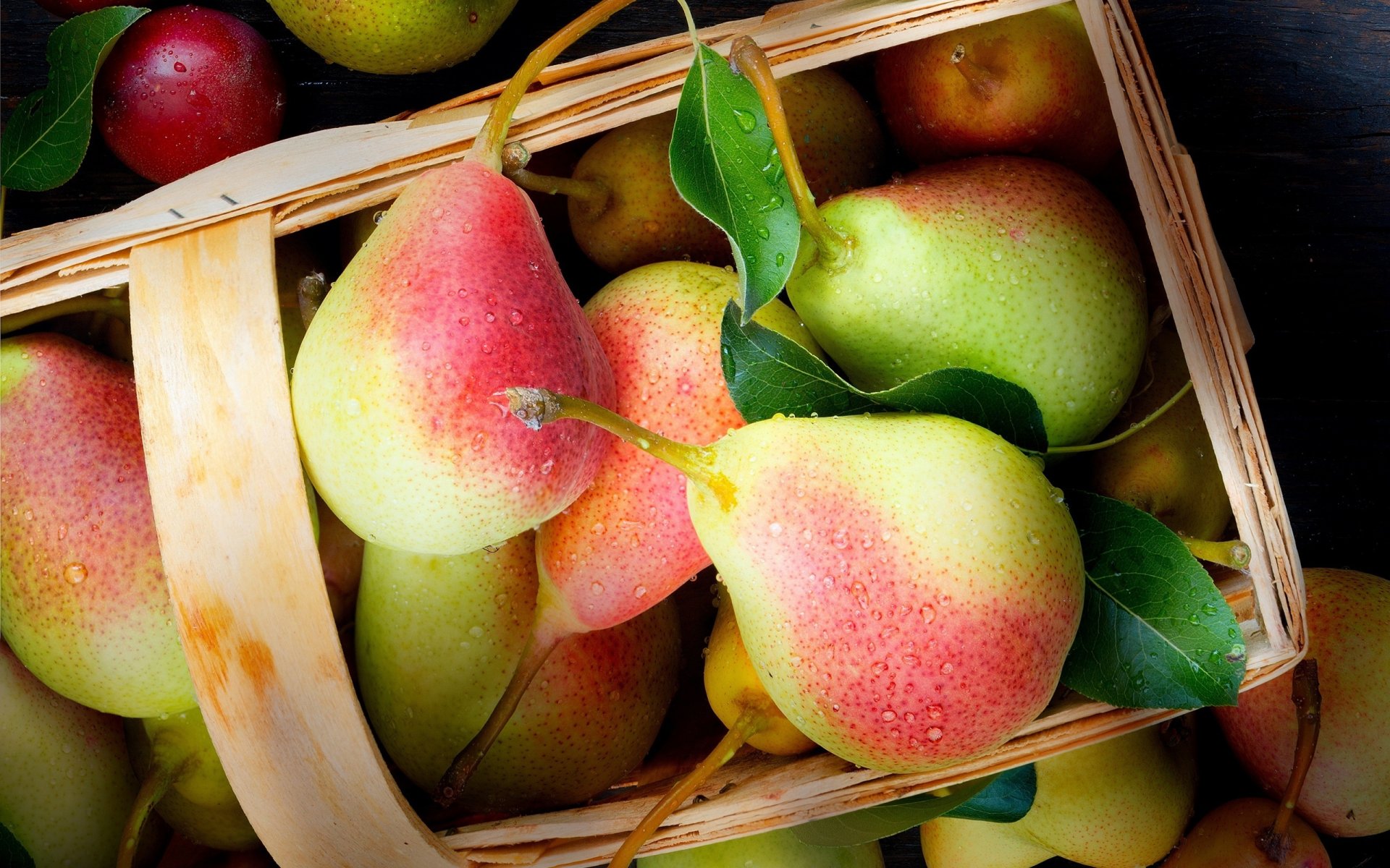 Zbierz gruszki w koszu. Gruszki z czerwoną beczką