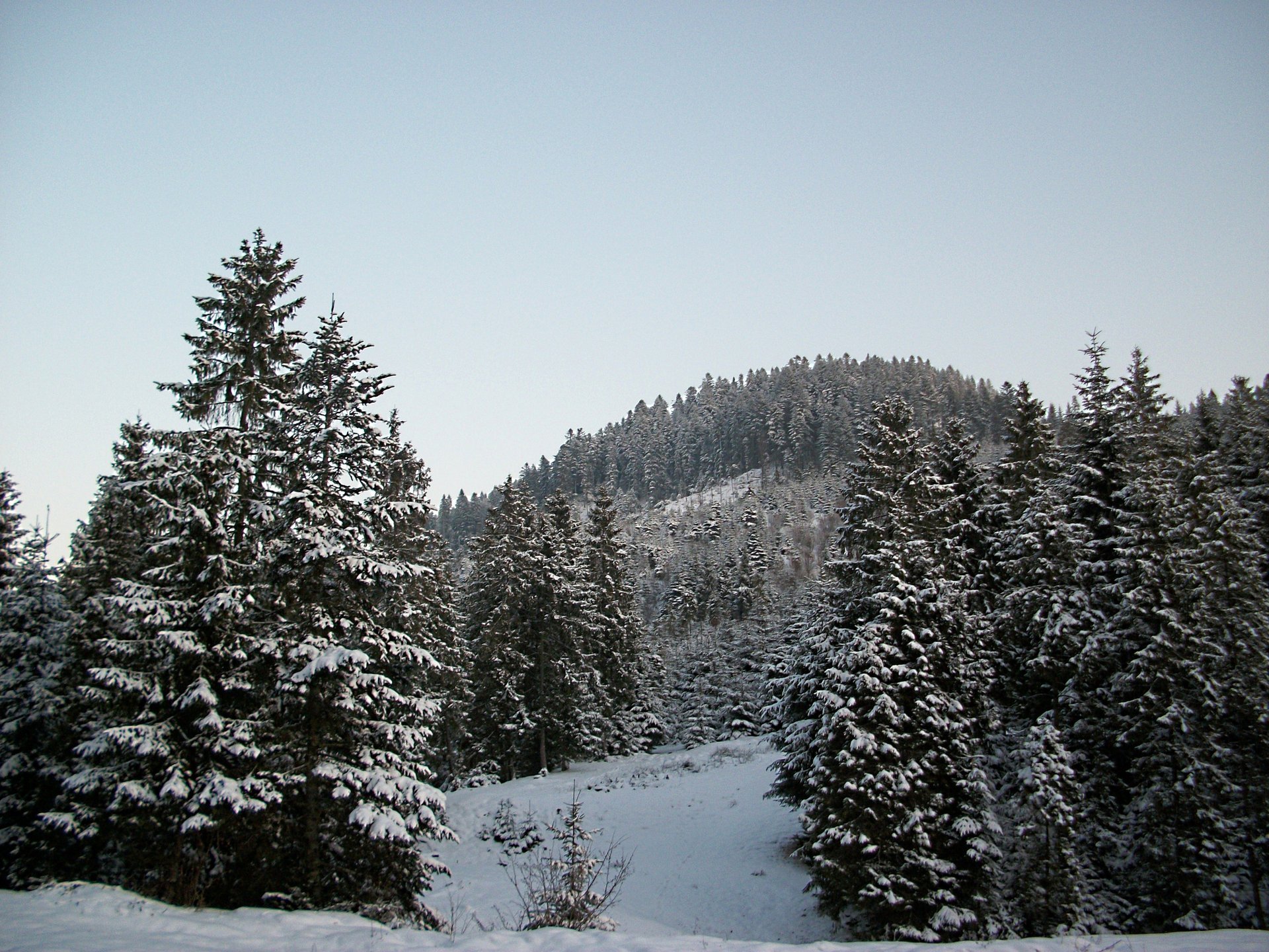 Choinki w śniegu. Schodzi mgła. Niebo w pięknym kolorze