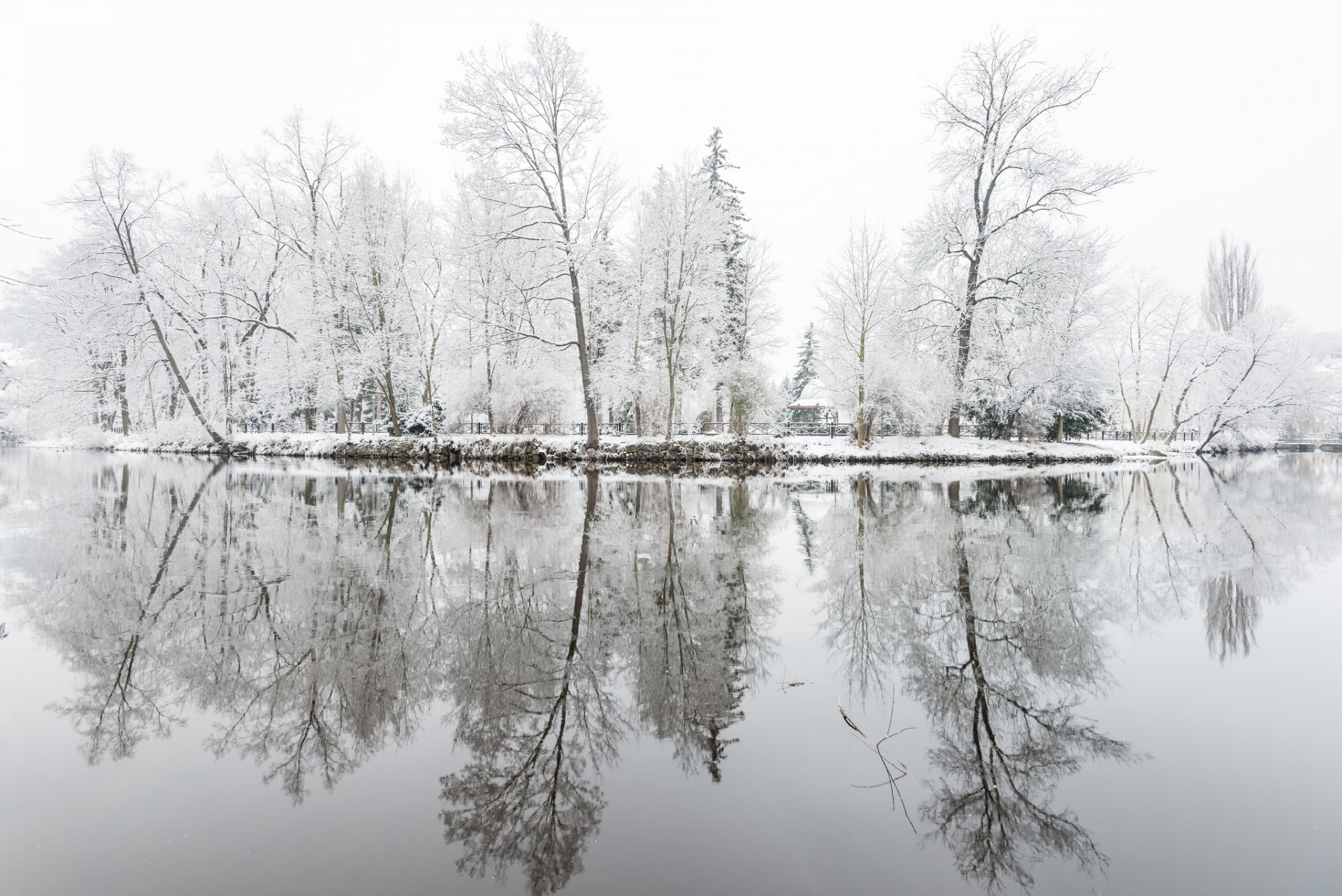 Odbicie dziewczyny drzewa i chmur w wodzie