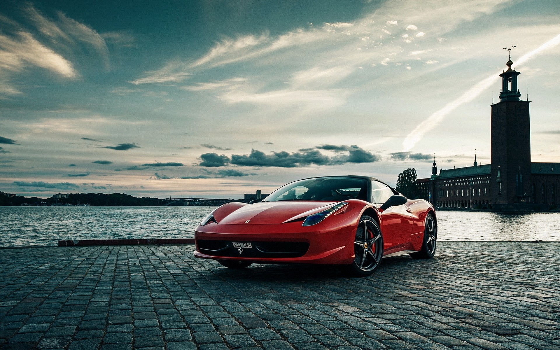 Czerwony samochód ferrari 458 italia wjeżdża do garażu