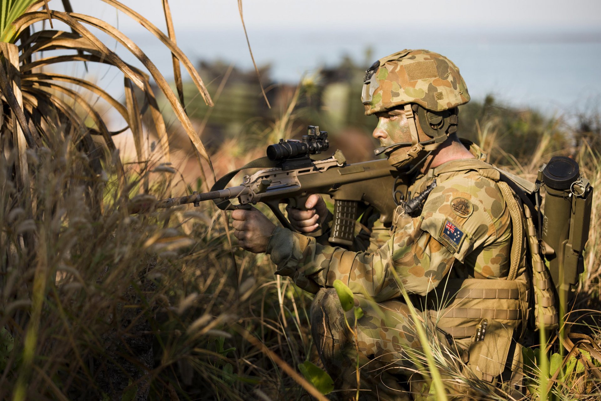 Srldat patrzy przez lornetkę leżąc na ziemi
