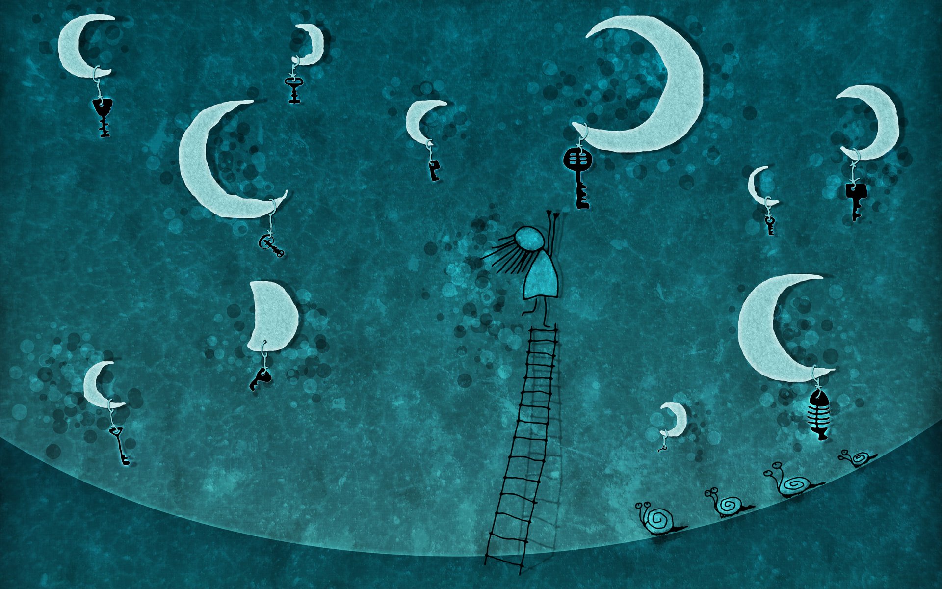 Rysunek graficzny mężczyzny wyciągającego klucze z Księżyca