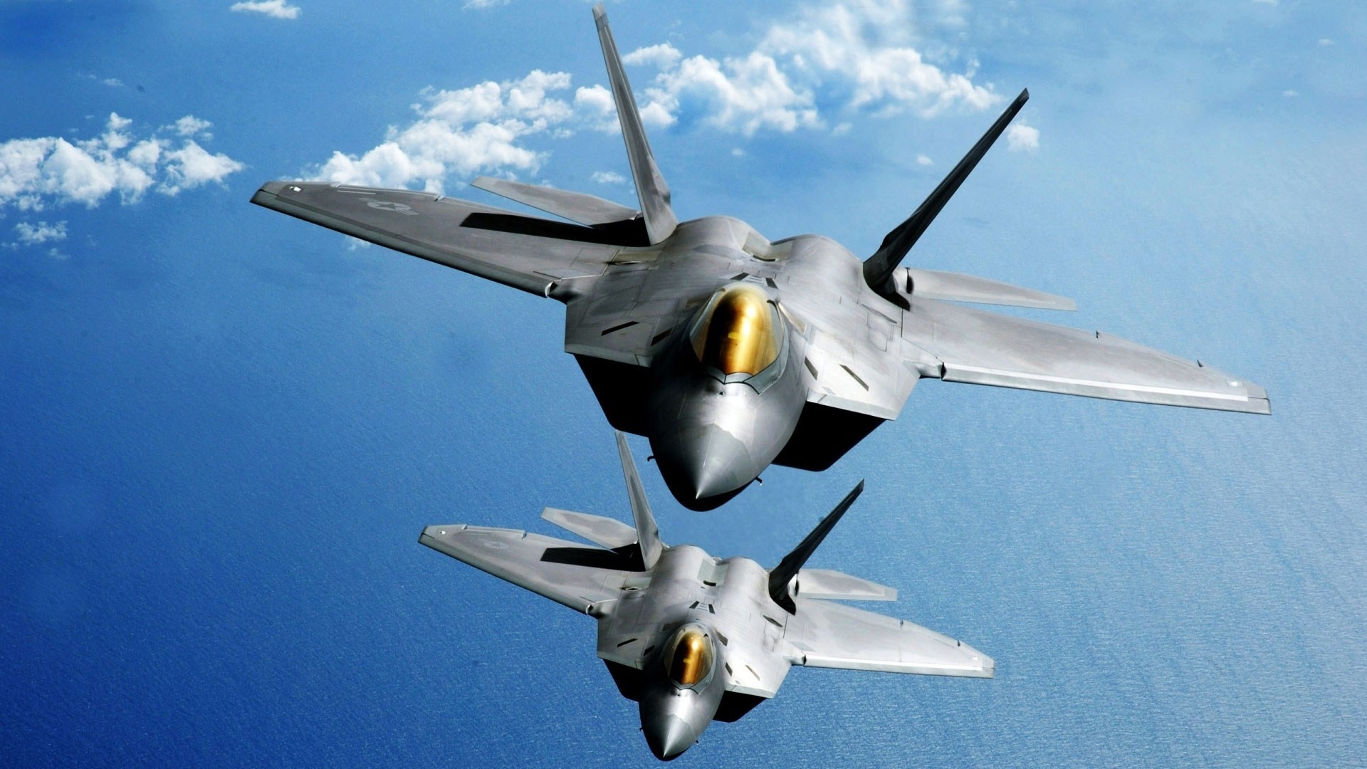 Dwa wojskowe samoloty myśliwskie f-22 latające nad oceanem