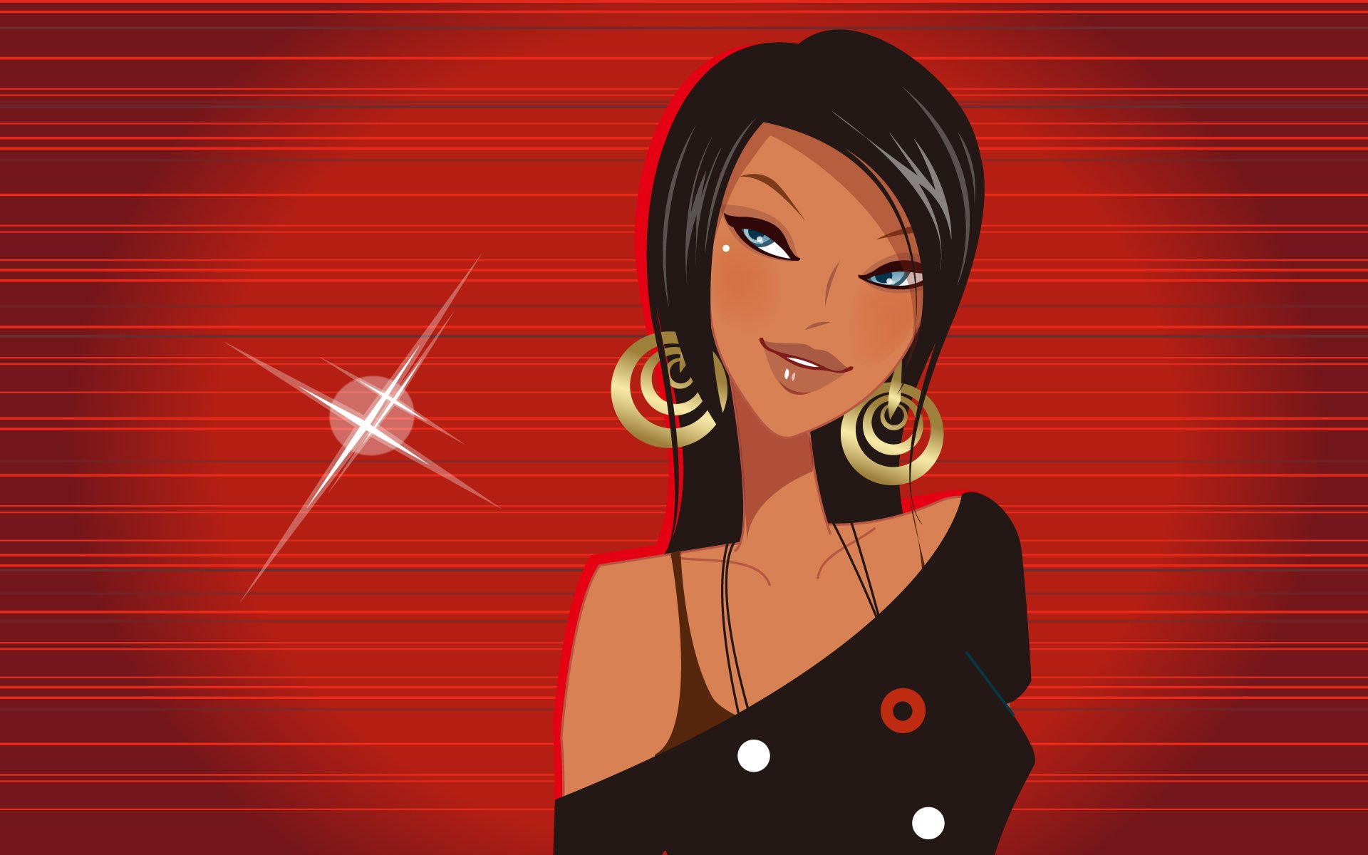 Ciemnowłosa dziewczyna ze stylowymi kolczykami w uszach na czerwonym tle
